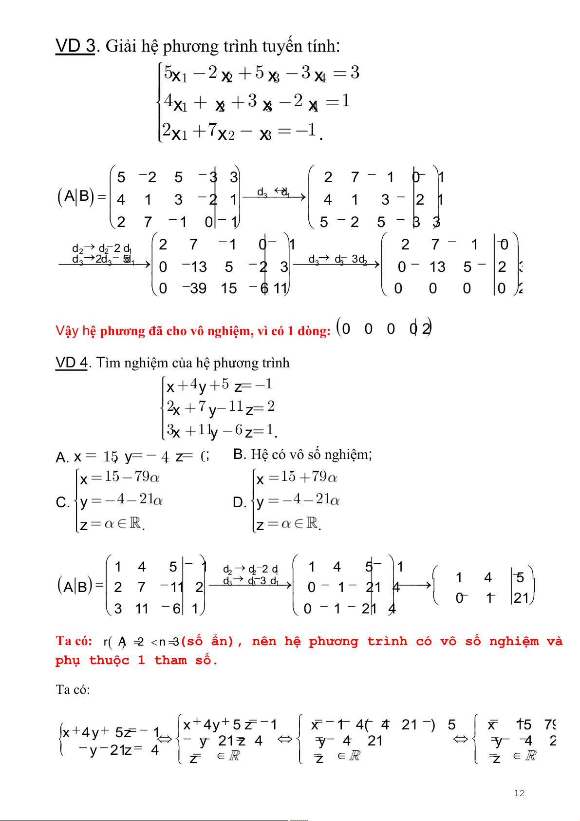 VD 3. Giải hệ phương trình tuyến tính: x 5 1 2 x2 5 x3 3 x4 3 4x 3 2 1 1 x2 x3 x4 2x1 7x2 x3 1. 5 −2 5 − 3 3 2 7 − 1 0− 1 ( A B) d d 3 1 = 4 1 3 − 2 1 ⎯⎯⎯⎯ → 4 1 3 − 2 1 2 7 1 0 1 5 2 5 3 3 − − − − − − − − d → d − d 2 7 1 0 1 2 7 1 0 2 2 2 1 d →2d − 5d d → d− 3d 3 3 1 3 3 2 ⎯⎯⎯⎯⎯→ 0 13 − 5 − 2 3 ⎯⎯⎯⎯⎯→ 0 − 13 5 − 2 3 0 39 15 6 11 0 0 0 0 2 − − V (0 0 0 0 )