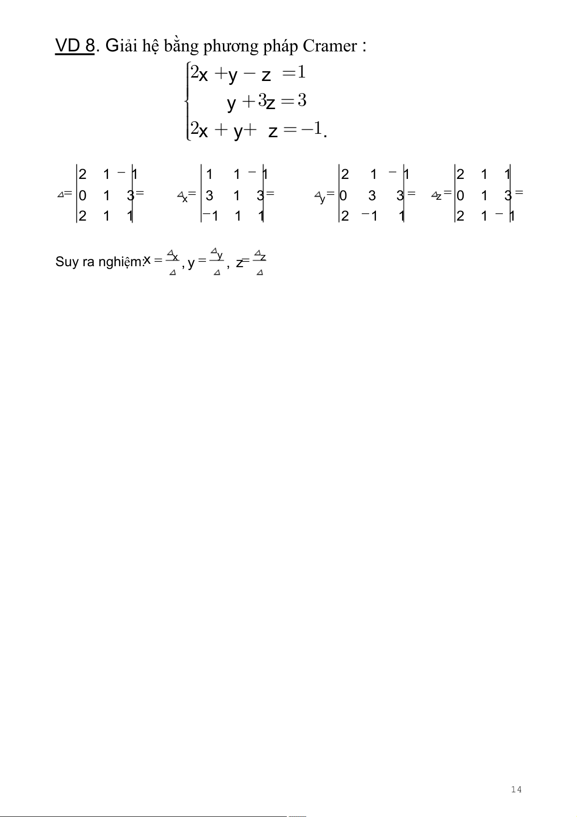 VD 8. Giải hệ bằng phương pháp Cramer : x 2 y z 1 y z 3 3 x 2 y z 1. 2 1 − 1 1 1 − 1 2 1 − 1 2 1 1 = 0 1 3= = = = = = x 3 1 3 y 0 3 3 z = 0 1 3 2 1 1 −1 1 1 2 −1 1 2 1 − 1 Suy ra nghiệm: x , y y , z z x = = = 14
