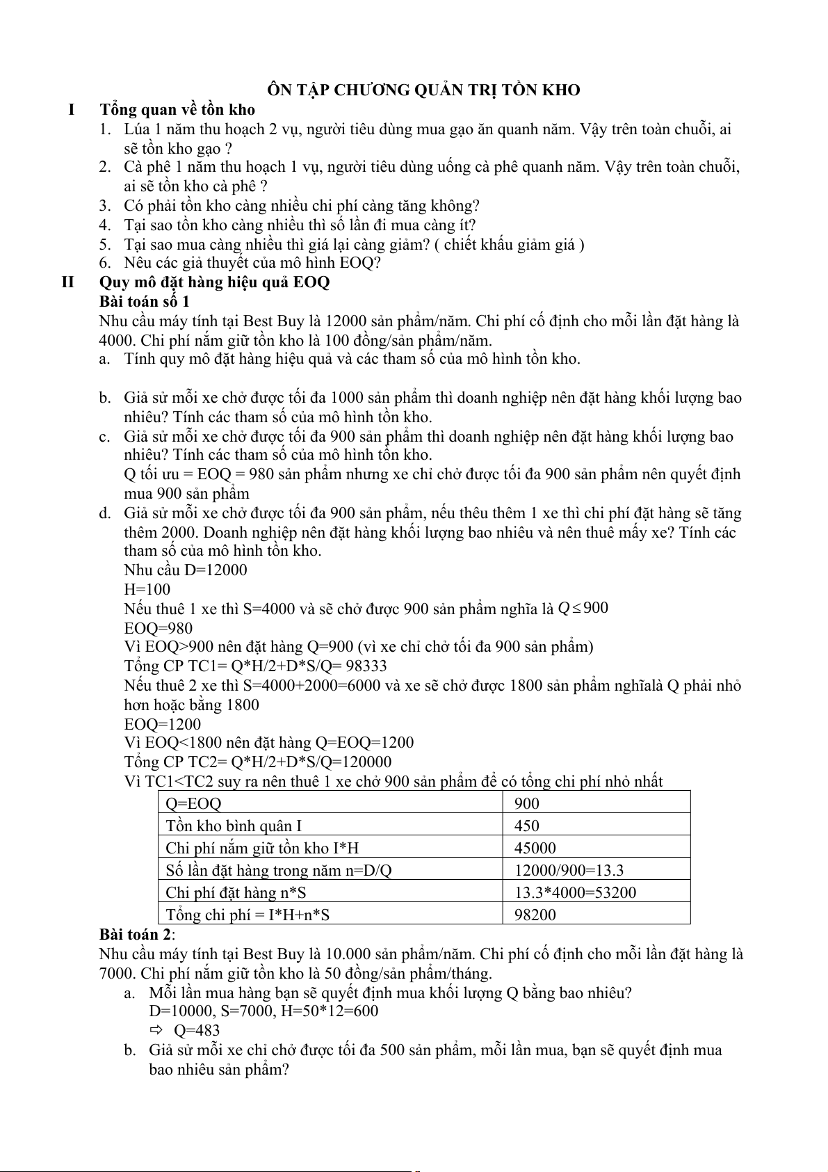 ÔN TẬP CHƯƠNG QUẢN TRỊ TỒN KHO I