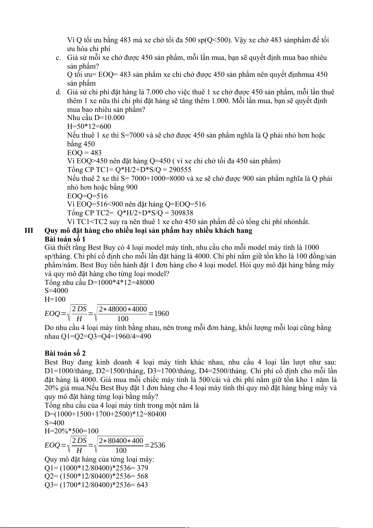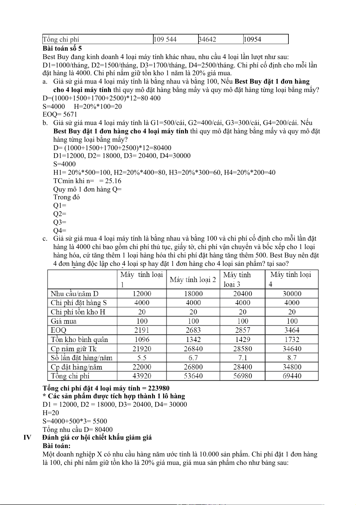 D1 = 12000, D2 = 18000, D3= 20400, D4= 30000 H=20 S=4000+500*3= 5500 Tổng nhu cầu D= 80400 IV
