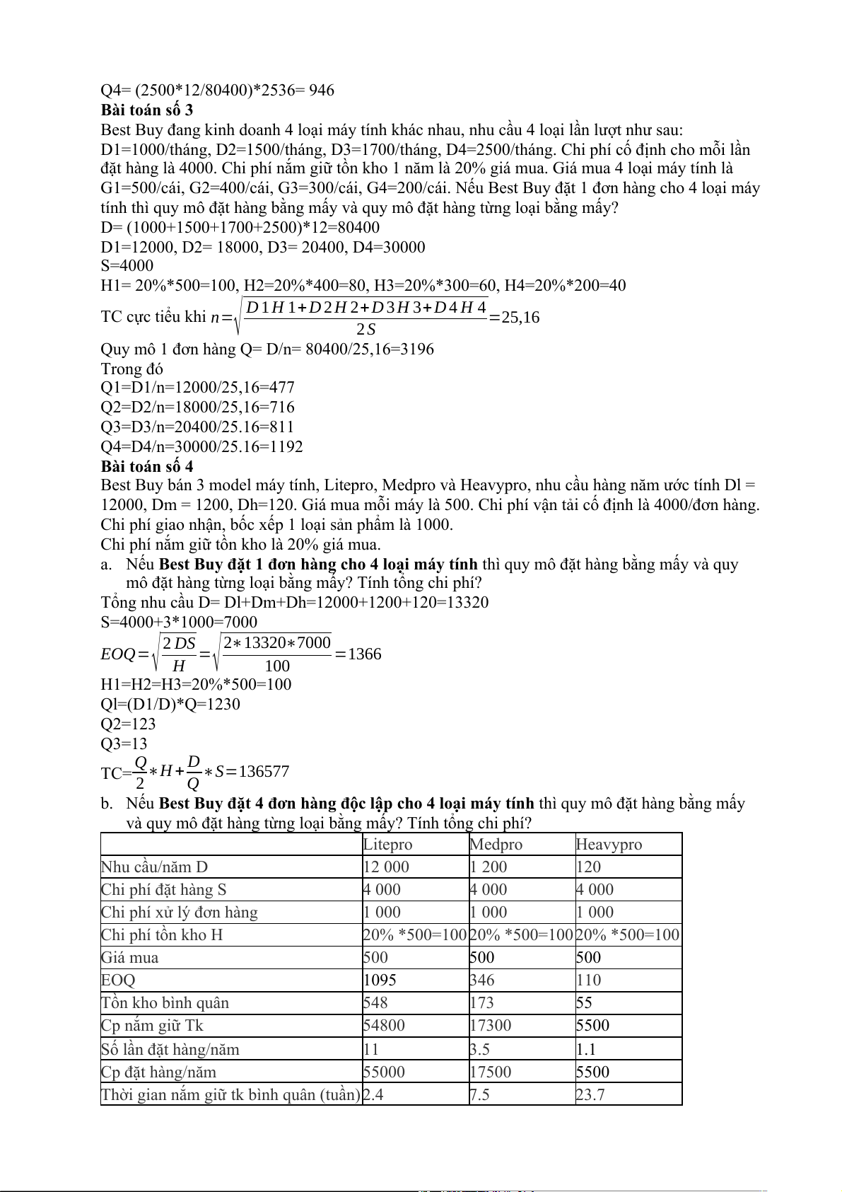 và quy mô đặt hàng từng loại bằng mấy? Tính tổng chi phí? Litepro Medpro Heavypro Nhu cầu/năm D 12 000 1 200 120 Chi phí đặt hàng S 4 000 4 000 4 000 Chi phí xử lý đơn hàng 1 000 1 000 1 000 Chi phí tồn kho H