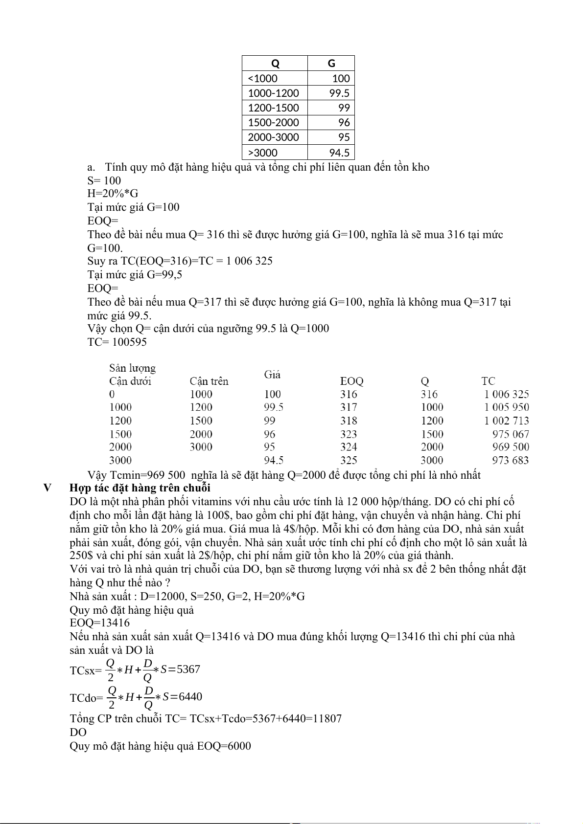 là 100, chi phí nắm giữ tồn kho là 20% giá mua, giá mua sản phẩm cho như bảng sau: Q G <1000 100 1000-1200 99.5 1200-1500 99 1500-2000 96 2000-3000 95 >3000 94.5