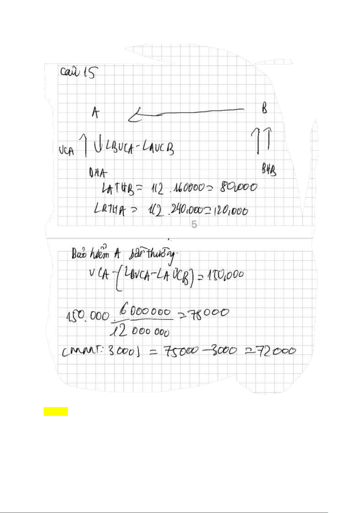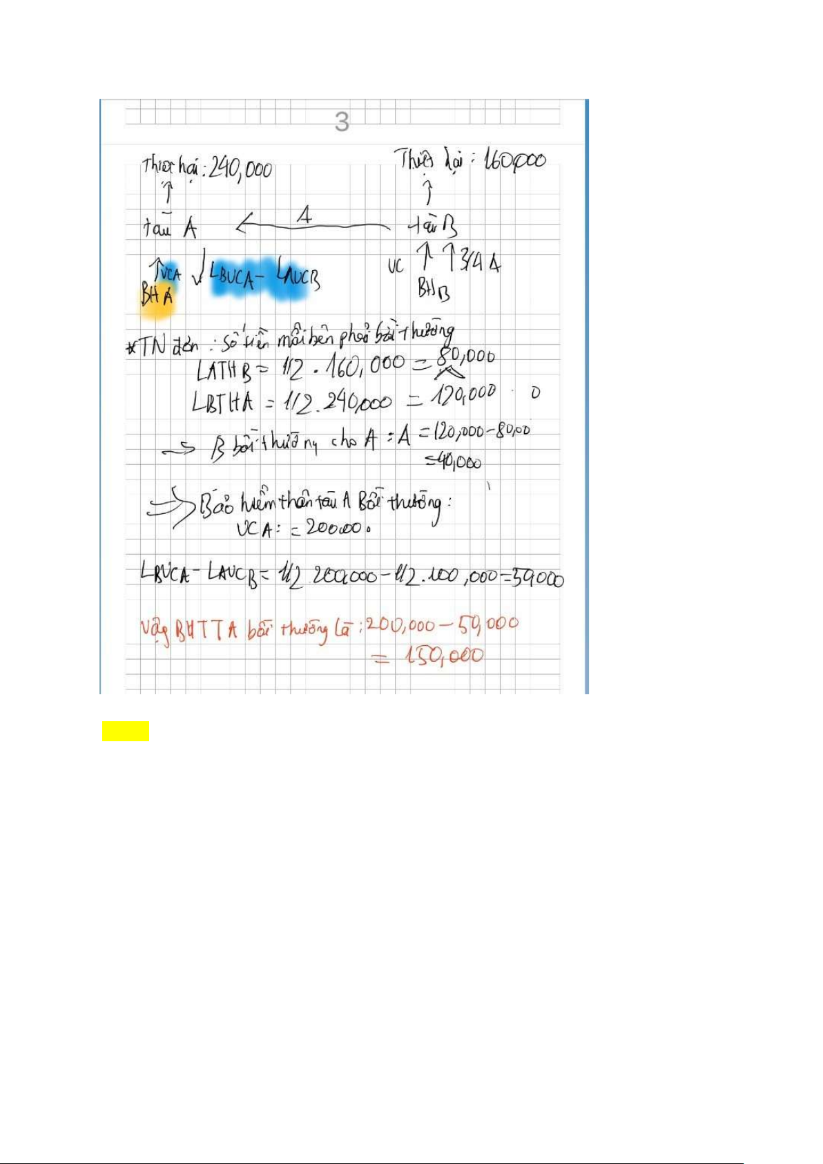 Câu hỏi 15 : Tàu A và B đâm va với nhau, lỗi tàu A ½ tàu B ½ gây thiệt hại thân tàu A: 200.000