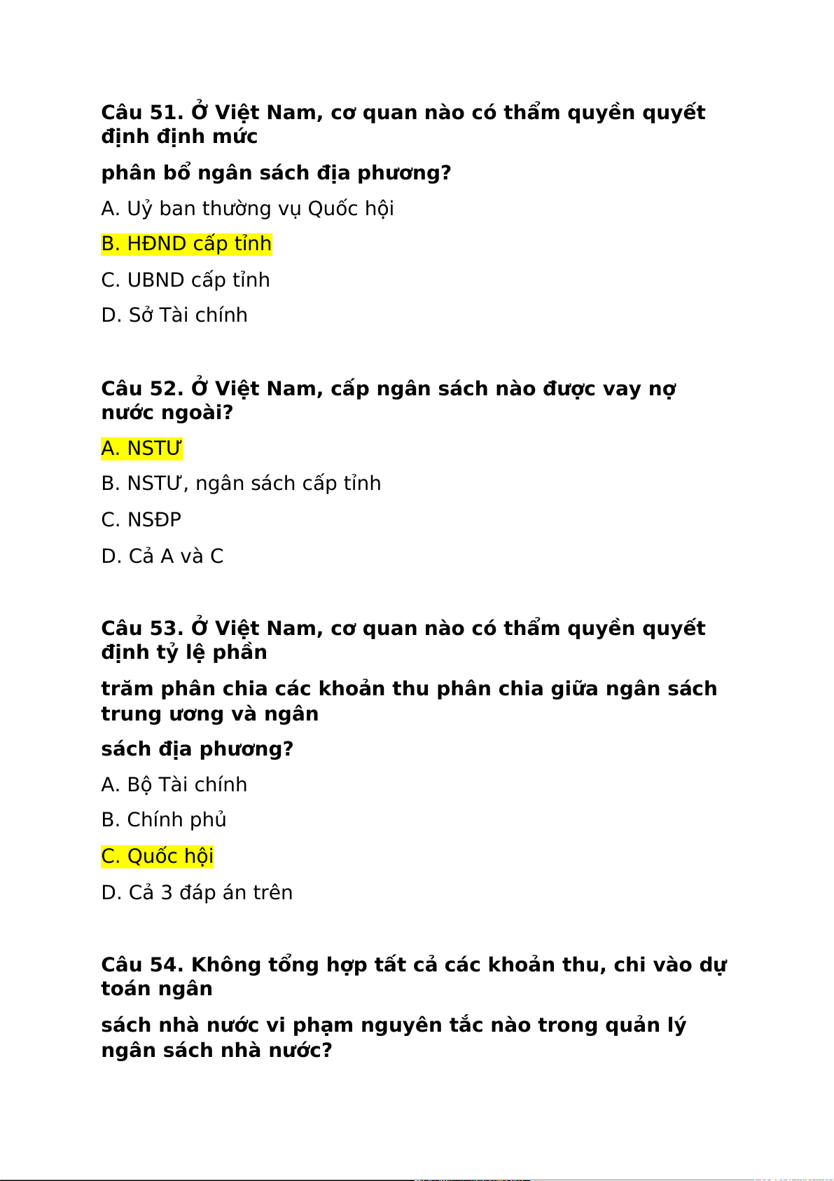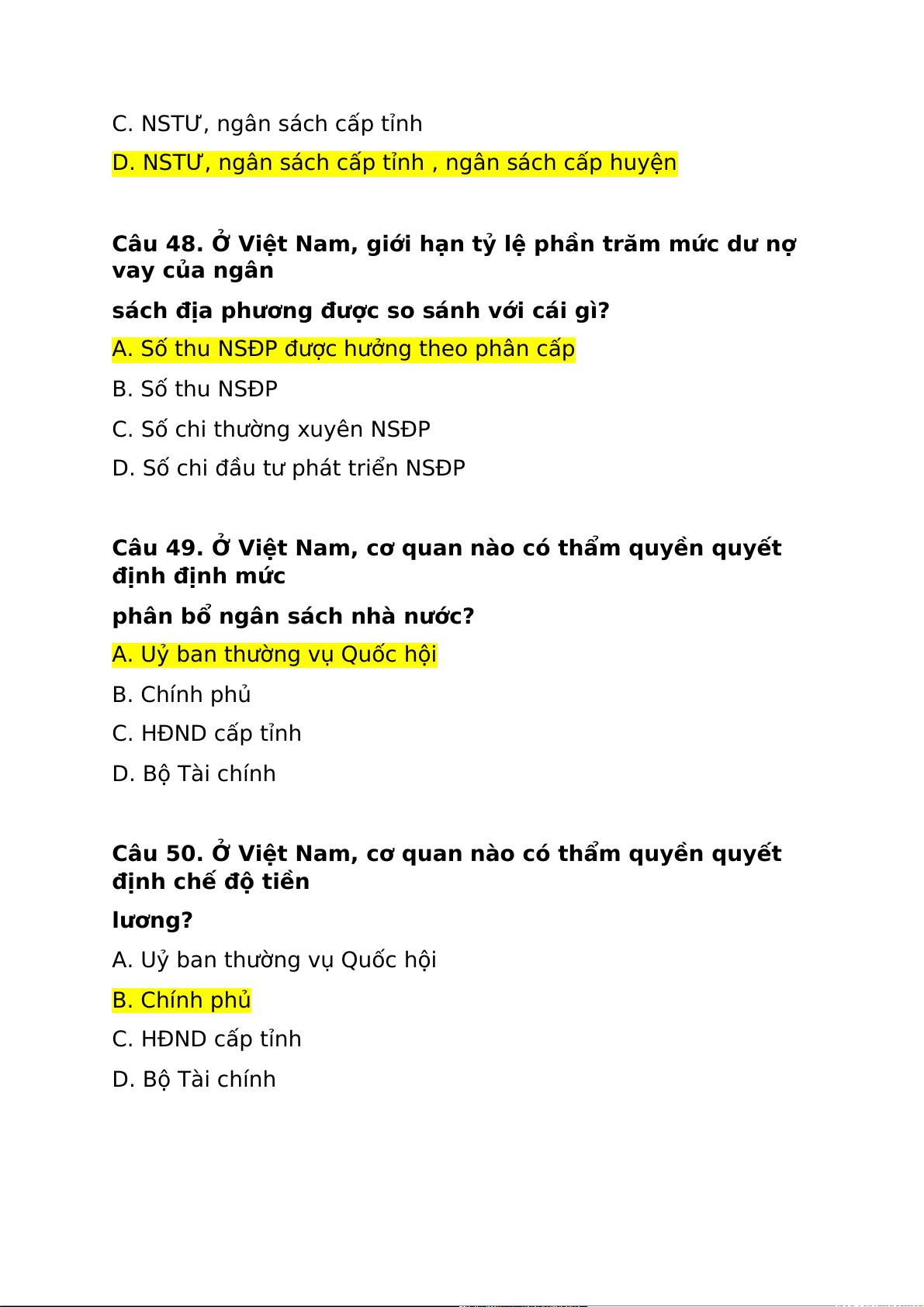 Câu 52. Ở Việt Nam, cấp ngân sách nào được vay nợ nước ngoài? A. NSTƯ