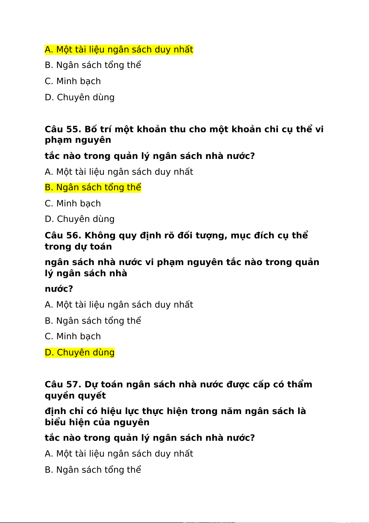 Câu 55. Bố trí một khoản thu cho một khoản chi cụ thể vi phạm nguyên