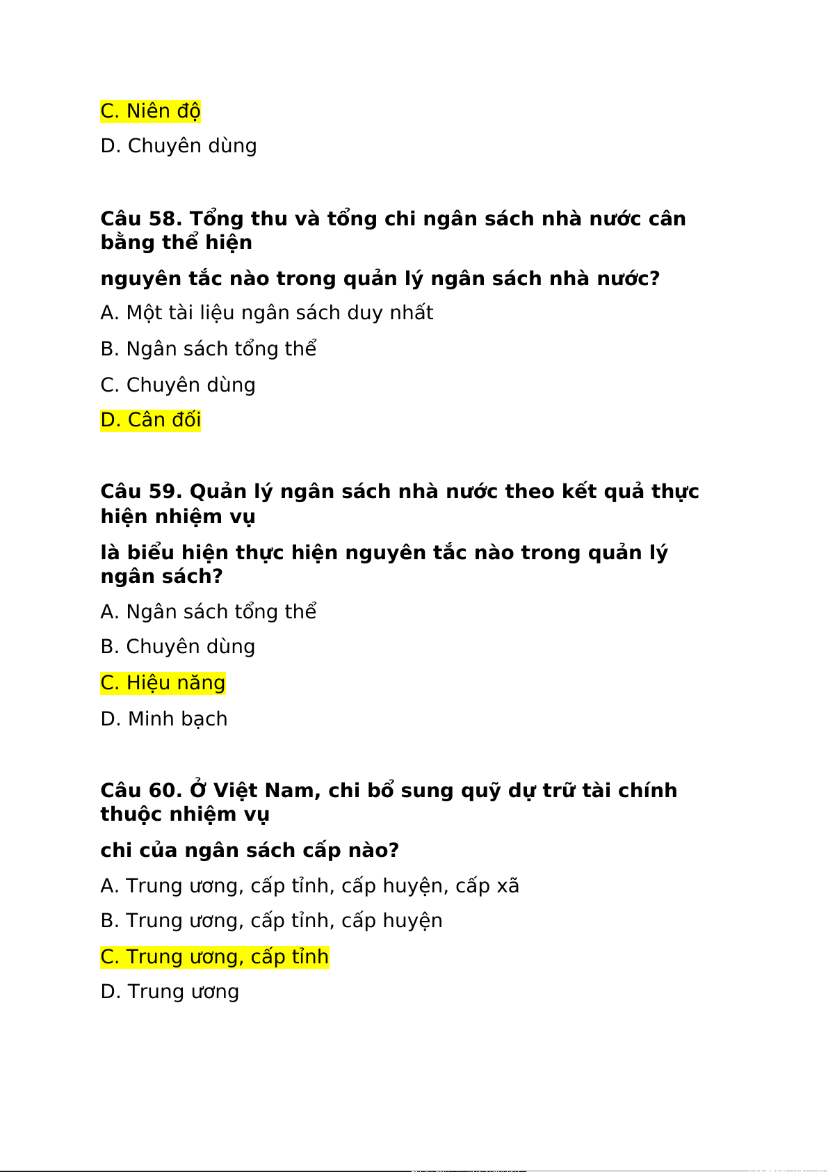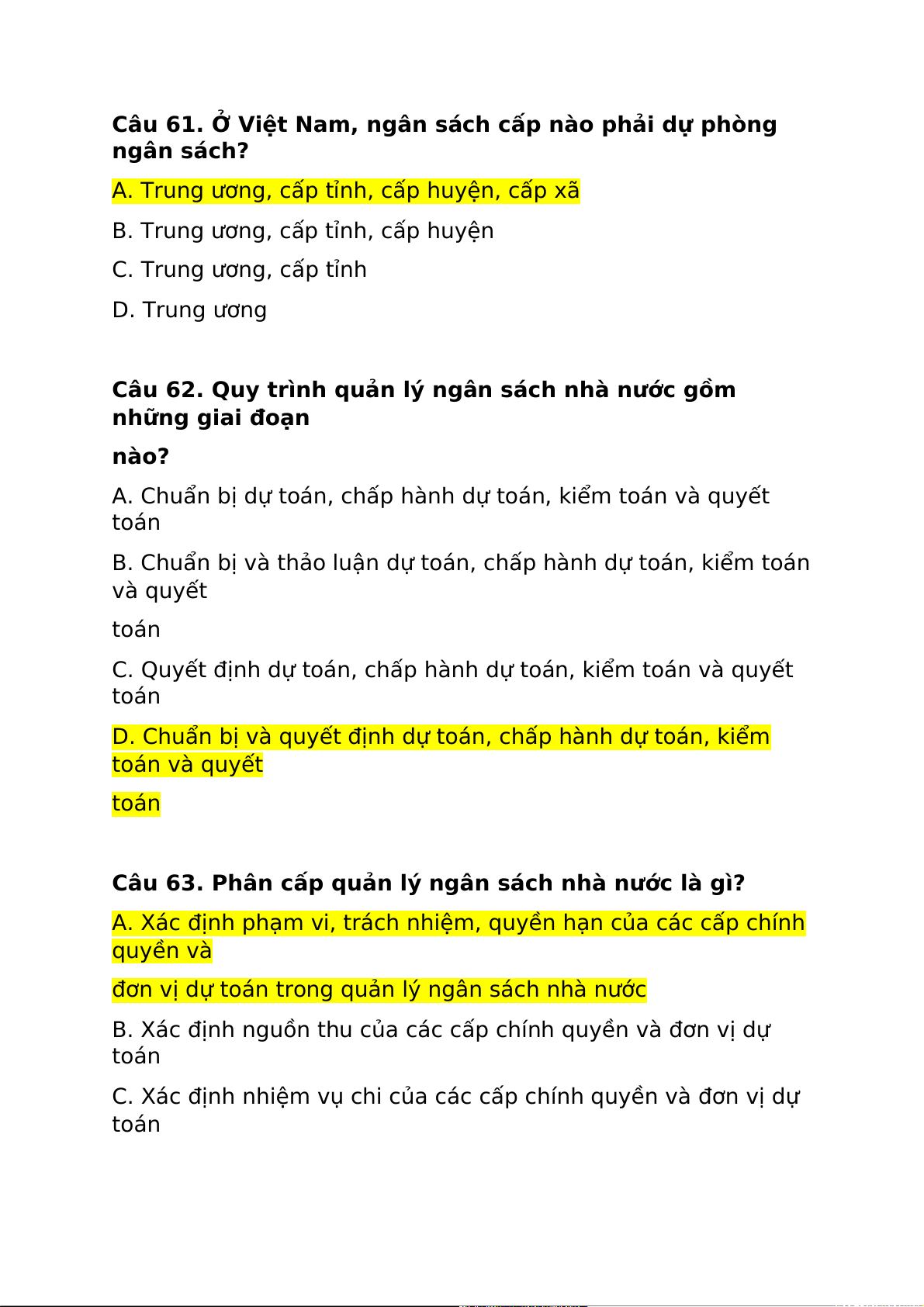 Câu 61. Ở Việt Nam, ngân sách cấp nào phải dự phòng ngân sách?