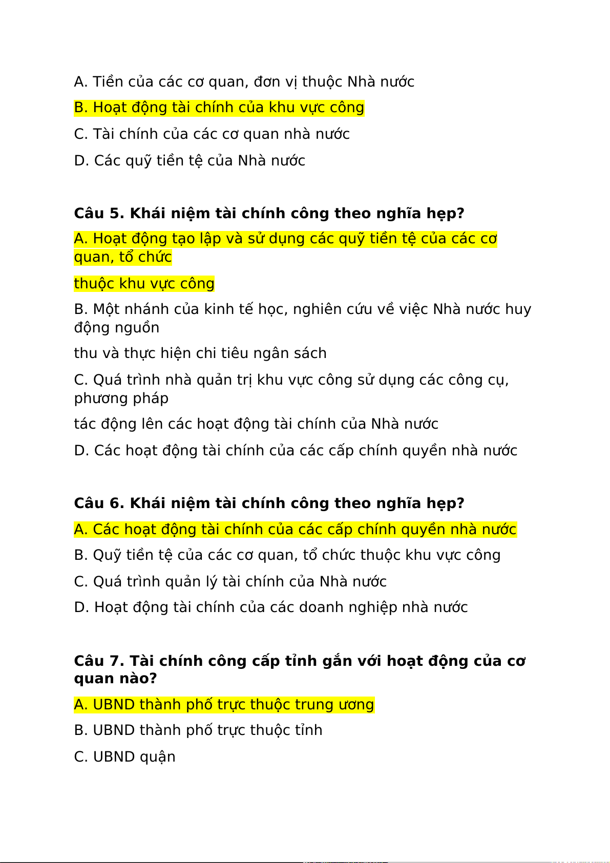 Câu 7. Tài chính công cấp tỉnh gắn với hoạt động của cơ quan nào?
