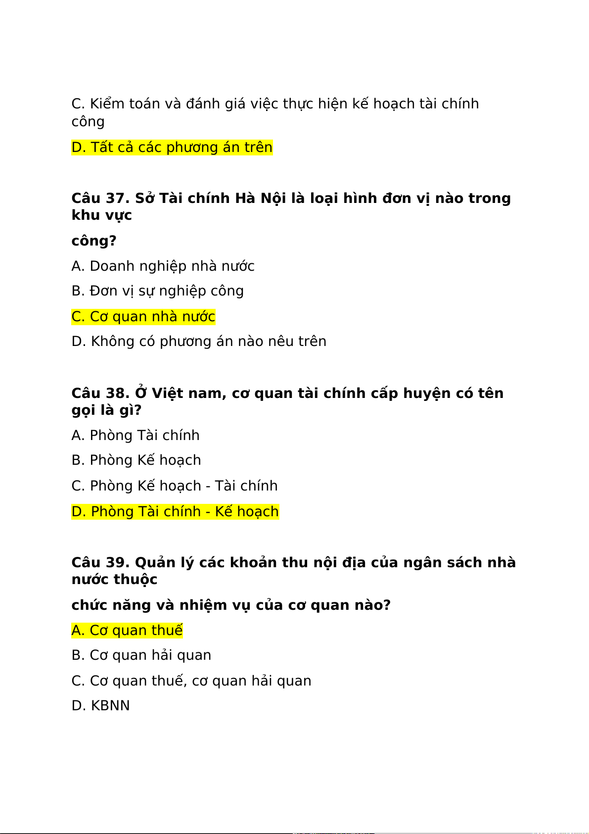 Câu 38. Ở Việt nam, cơ quan tài chính cấp huyện có tên gọi là gì? A. Phòng Tài chính B. Phòng Kế hoạch