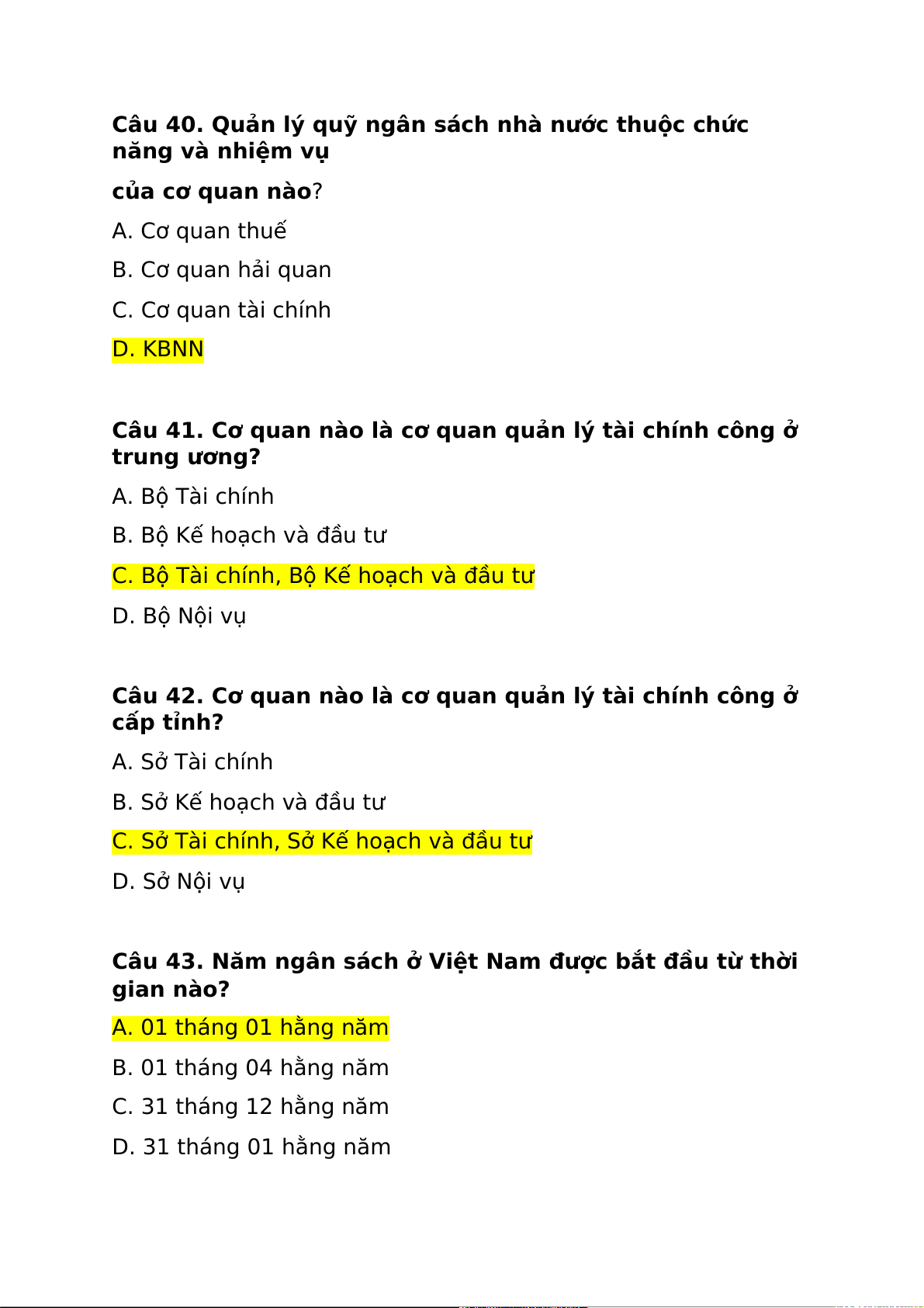 Câu 40. Quản lý quỹ ngân sách nhà nước thuộc chức năng và nhiệm vụ của cơ quan nào? A. Cơ quan thuế B. Cơ quan hải quan C. Cơ quan tài chính D. KBNN