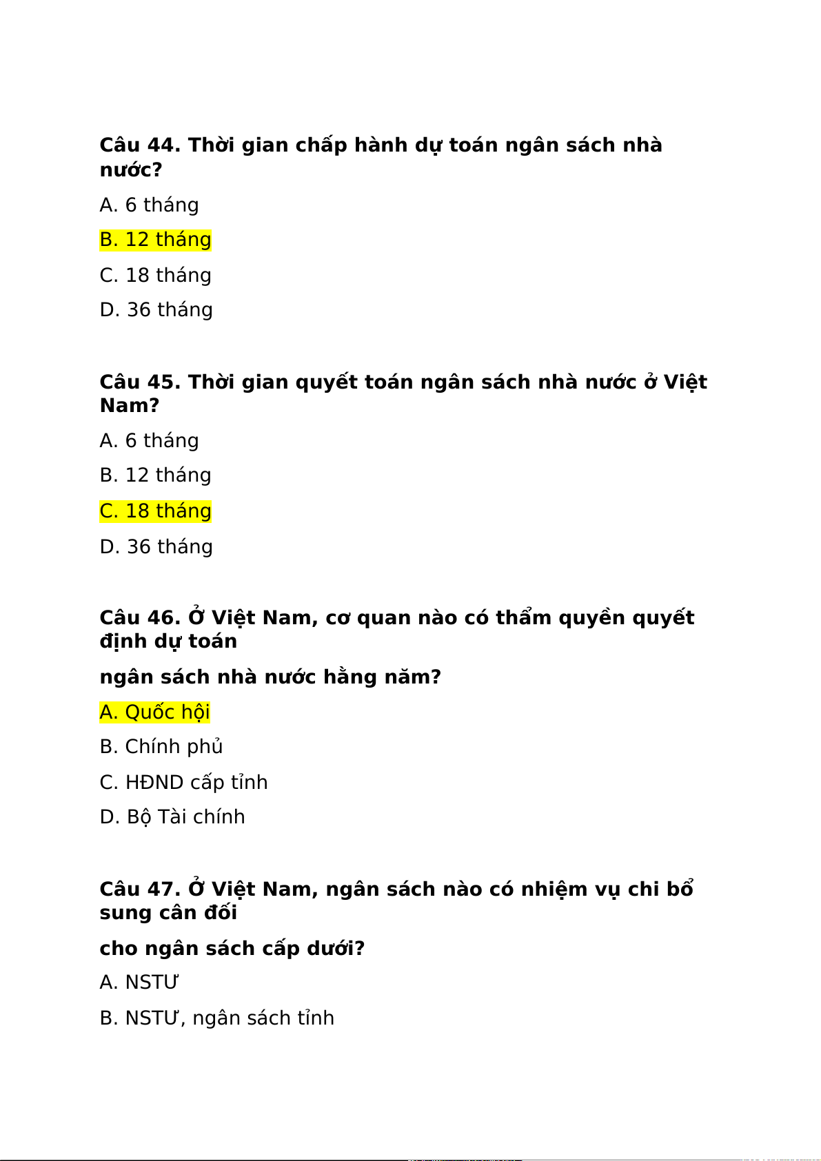 Câu 45. Thời gian quyết toán ngân sách nhà nước ở Việt Nam? A. 6 tháng B. 12 tháng C. 18 tháng D. 36 tháng