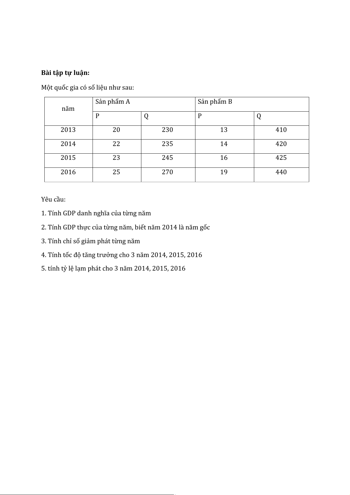 Một'quốc'gia'có'số'liệu'như'sau:' Sản'phẩm'A' Sản'phẩm'B' năm' P' Q' P' Q' 2013' 20' 230' 13' 410' 2014' 22' 235' 14' 420' 2015' 23' 245' 16' 425' 2016' 25' 270' 19' 440' ' Yêu'cầu:'