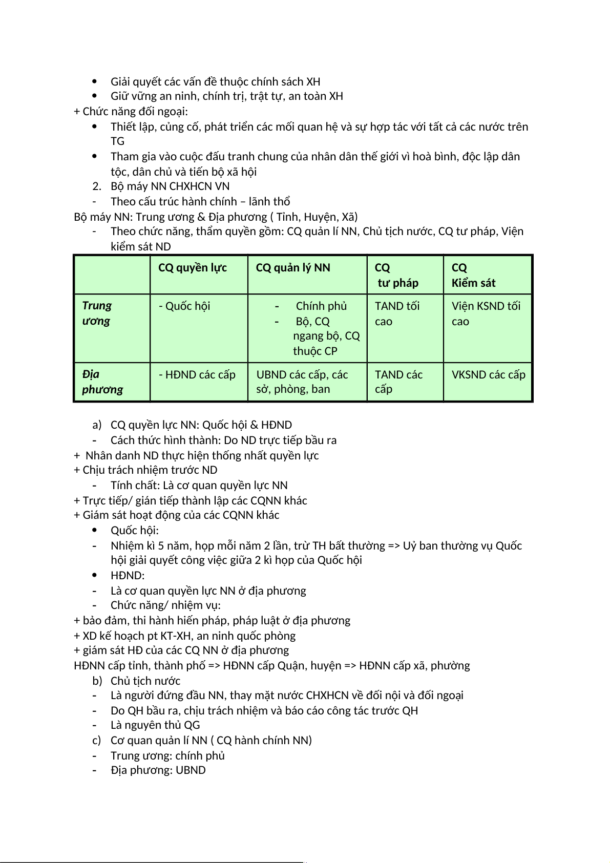 + Cơ quan hành pháp:(Chính phủ): thực hiện quyền quản lý xã hội trong các lĩnh vực của đời sống xã hội.