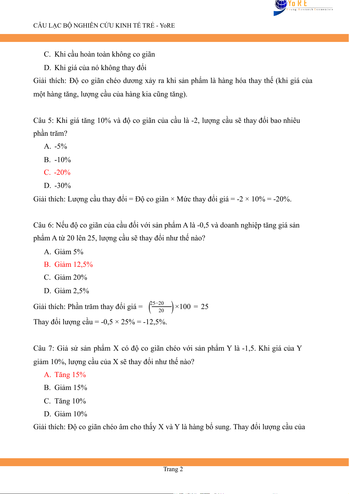 Câu 5: Khi giá tăng 10% và độ co giãn của cầu là -2, lượng cầu sẽ thay đổi bao nhiêu phần trăm? A. -5% B. -10% C. -20% D. -30%