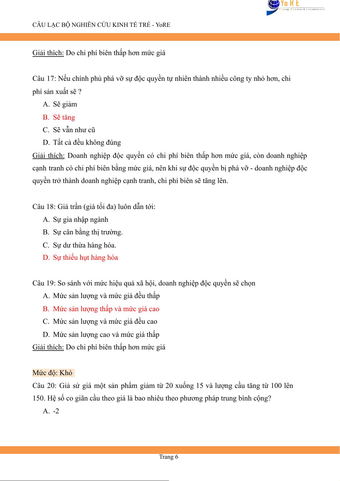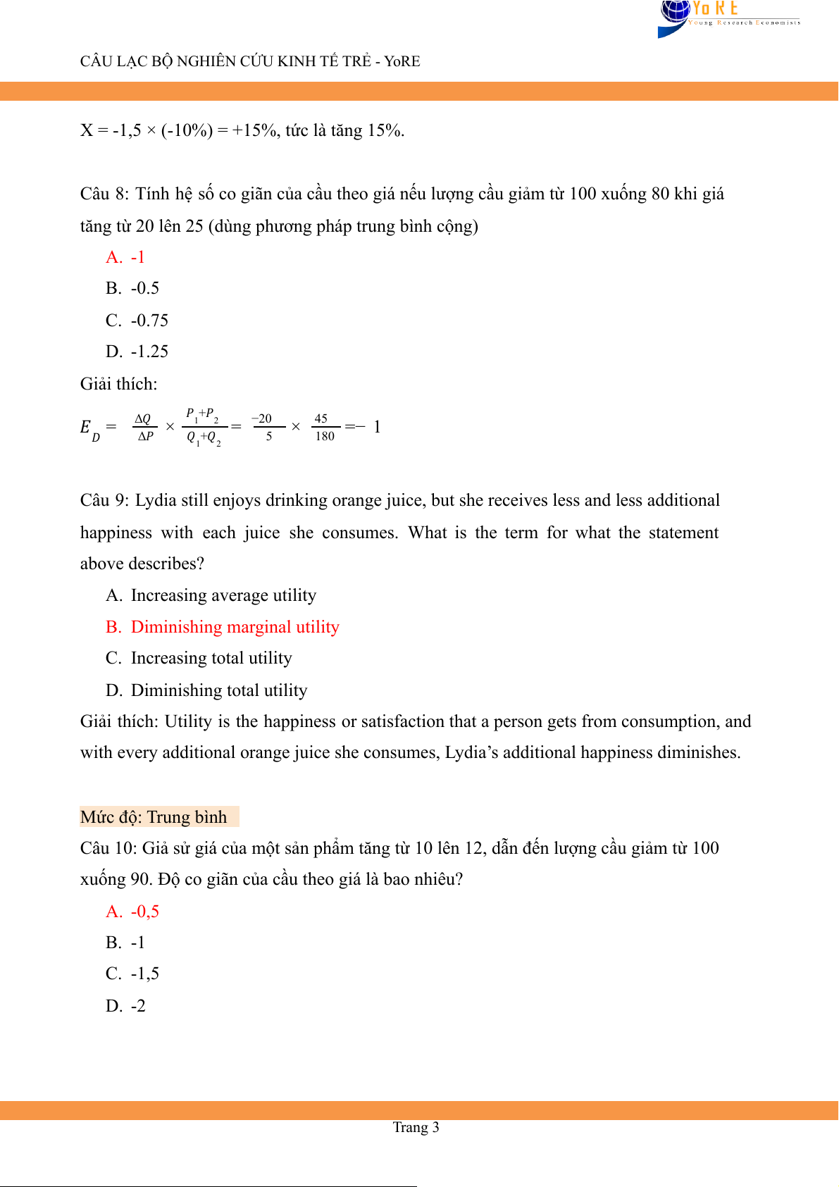 CÂU LẠC BỘ NGHIÊN CỨU KINH TẾ TRẺ - YoRE B. -1.4 C. -1 D. -0.5 Giải thích: