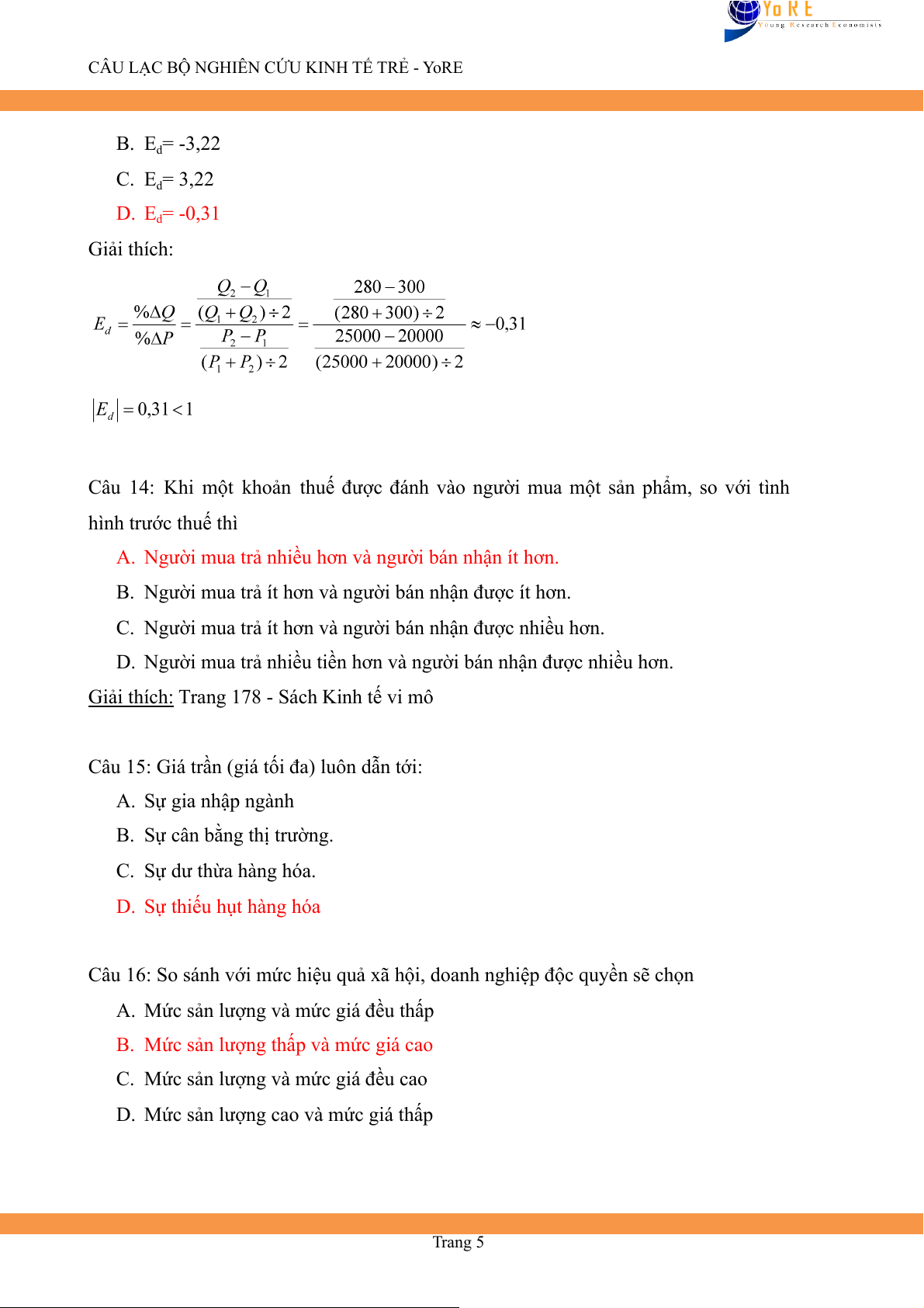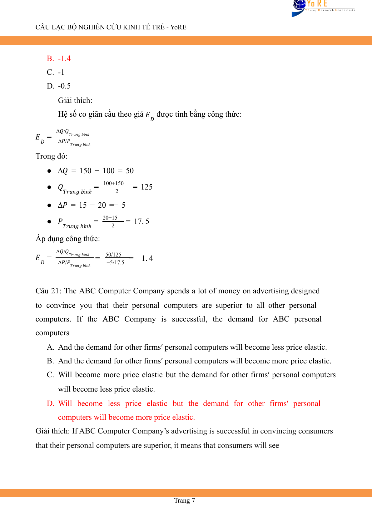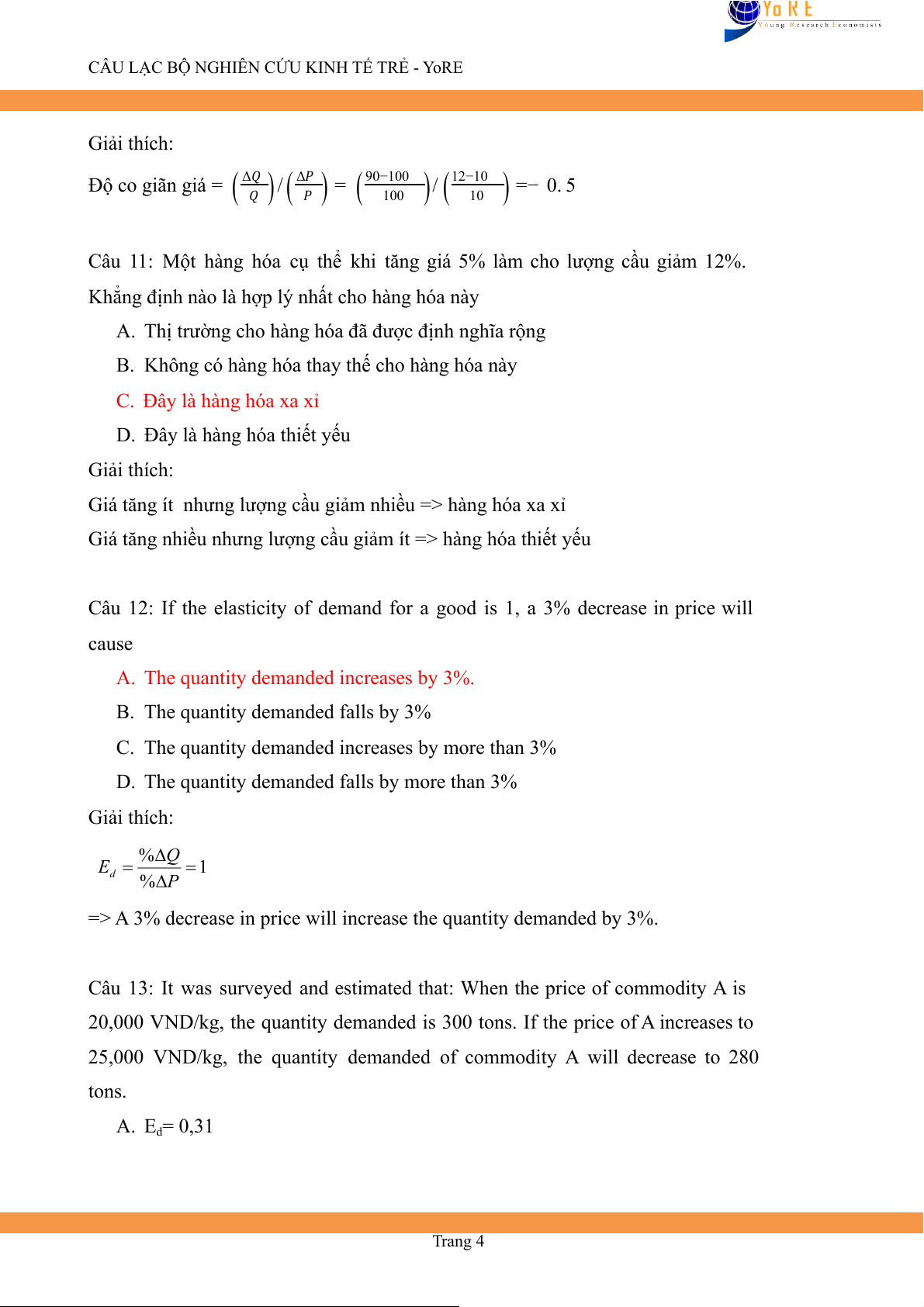 CÂU LẠC BỘ NGHIÊN CỨU KINH TẾ TRẺ - YoRE B. Ed= -3,22 C. Ed= 3,22 D. Ed= -0,31 Giải thích: