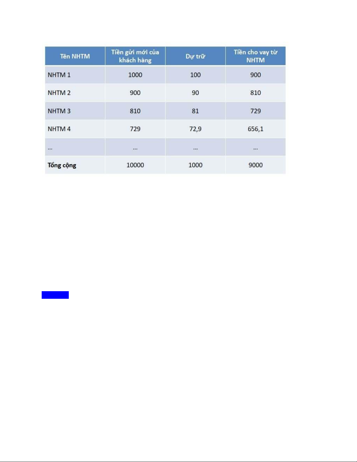 - dân chúng gửi toàn bộ vào nhtm dưới dạng tiền gửi k kỳ hạn, nhtm dự trữ 10% và cho vay trở lại dân chúng 90%. • D=1000, R=10%.1000=100