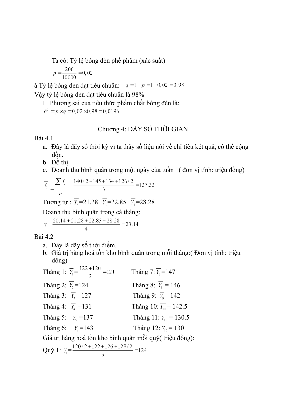 Giá trị hàng hoá tồn kho bình quân mỗi quý( triệu đồng): Quý 1: = Quý 2: = Quý 3: = = 145 Quý 4: = = 137.33