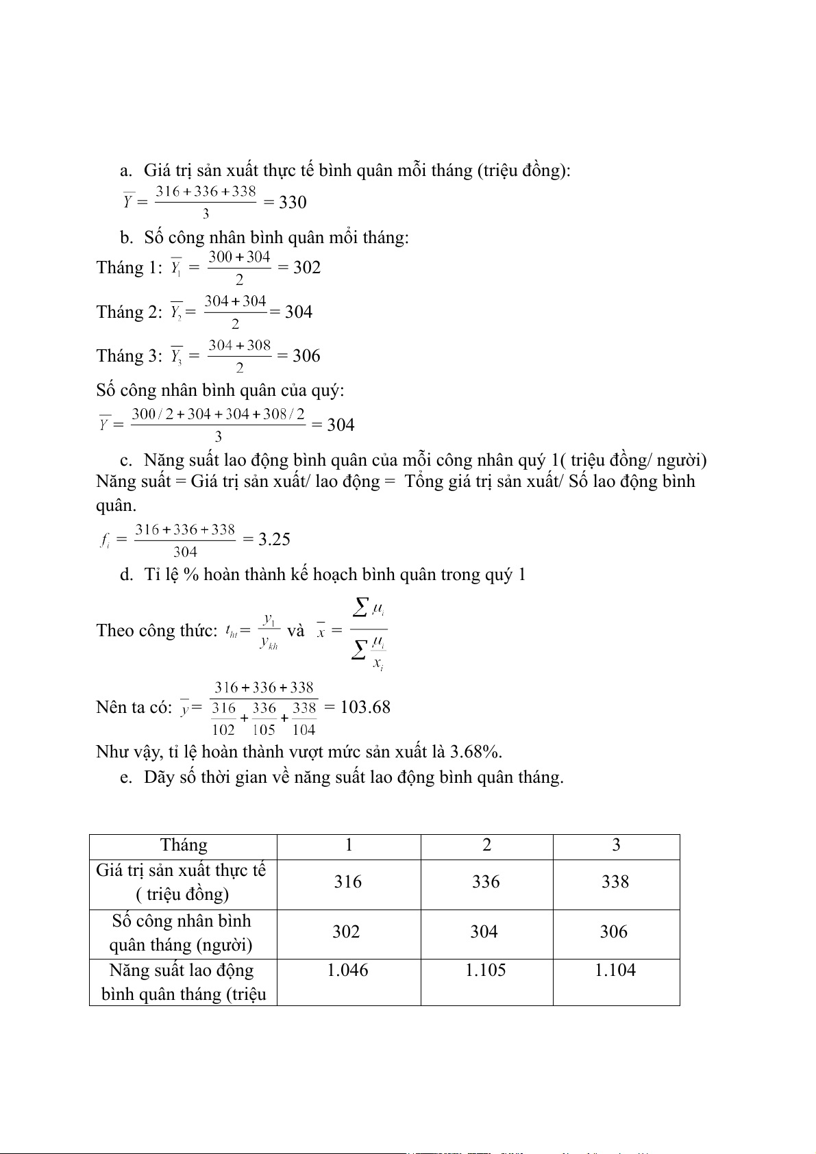 d. Tỉ lệ % hoàn thành kế hoạch bình quân trong quý 1 Theo công thức: = và = Nên ta có: = = 103.68