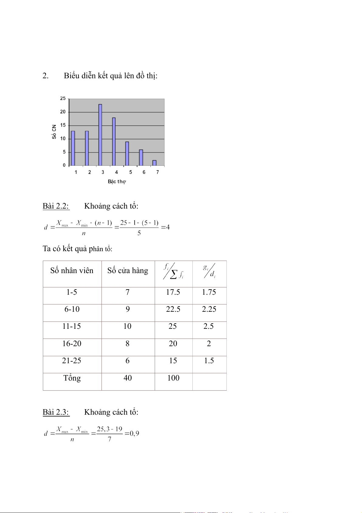 Biểu diễn kết quả lên đồ thị: Bài 2.2: Khoảng cách tổ: Ta có kết quả phân tổ: Số nhân viên Số cửa hàng 1-5 7 17.5 1.75 6-10 9 22.5 2.25 11-15 10 25 2.5 16-20 8 20 2 21-25 6 15 1.5 Tổng 40 100 Bài 2.3: Khoảng cách tổ: Kết quả phân tổ: Tần số tích Thời gian Số CN Tần suất luỹ 19 -19.9 5 0.1 5 19.9 - 20.8 6 0.12 11 20.8 - 21.7 9 0.18 20 21.7 - 22.6 5 0.1 25 22.6 - 23.5 7 0.14 32 23.5 - 24.4 14 0.28 46 24.4 - 25.3 4 0.08 50 Tổng 50 1