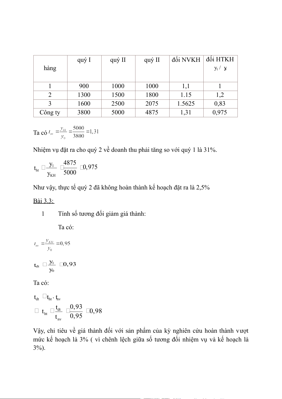 Như vậy, thực tế quý 2 đã không hoàn thành kế hoạch đặt ra là 2,5% Bài 3.3: 1