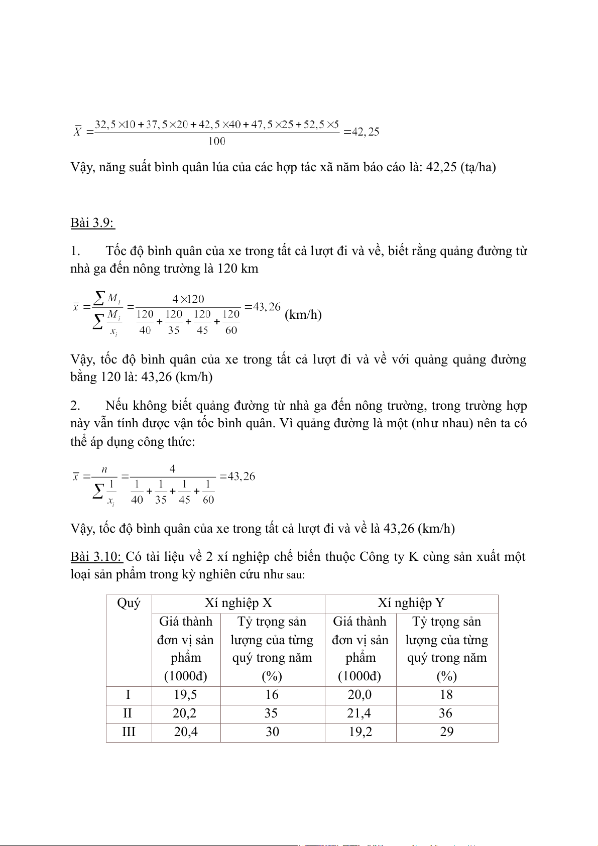Vậy, năng suất bình quân lúa của các hợp tác xã năm báo cáo là: 42,25 (tạ/ha) Bài 3.9: 1.