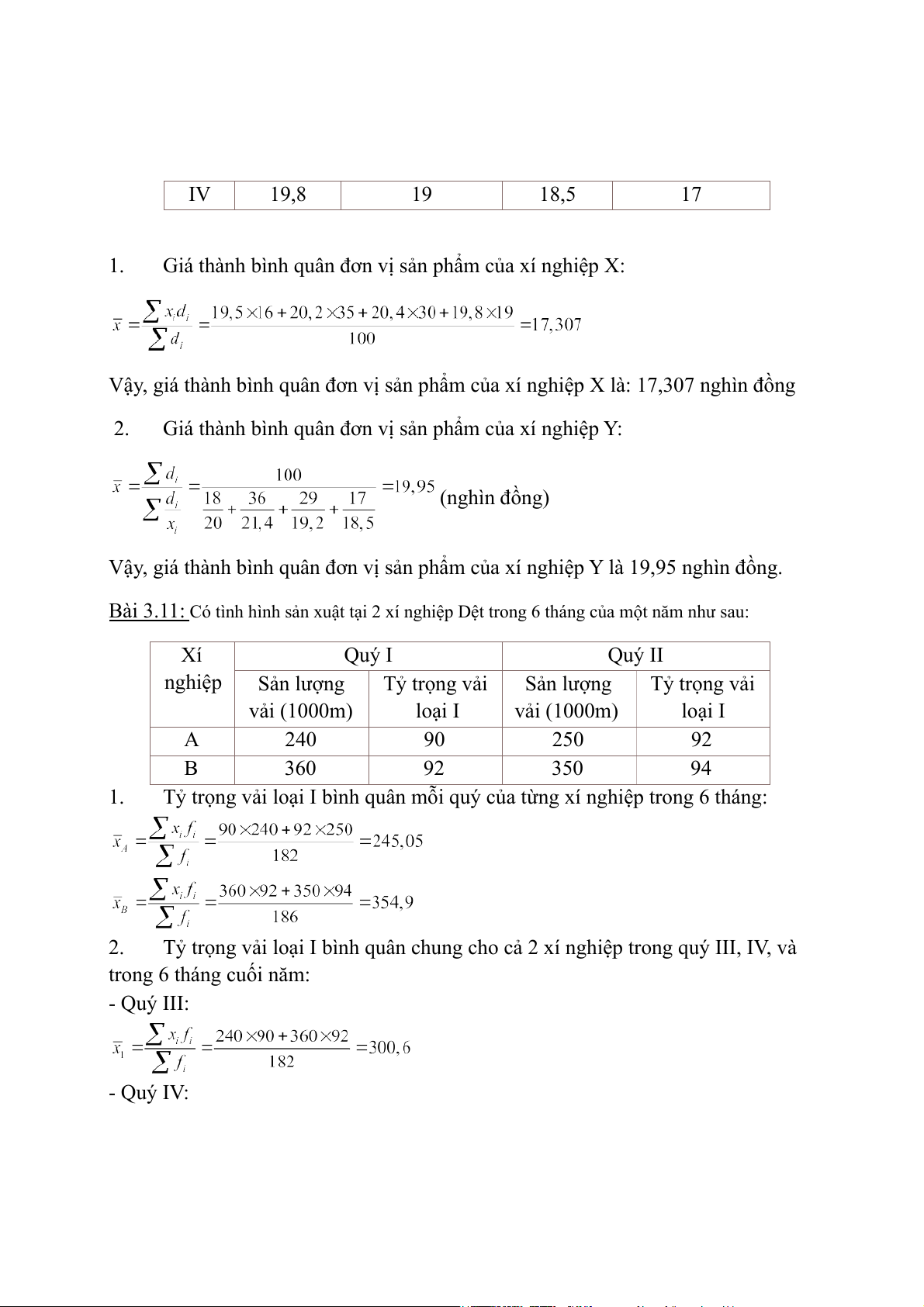 Tỷ trọng vải loại I bình quân chung cho cả 2 xí nghiệp trong quý III, IV, và trong 6 tháng cuối năm: - Quý III: - Quý IV: - 6 tháng cuối năm: x f i i 300,6 182 300,5 186 x 300,54 f 368 i Bài 3.12: