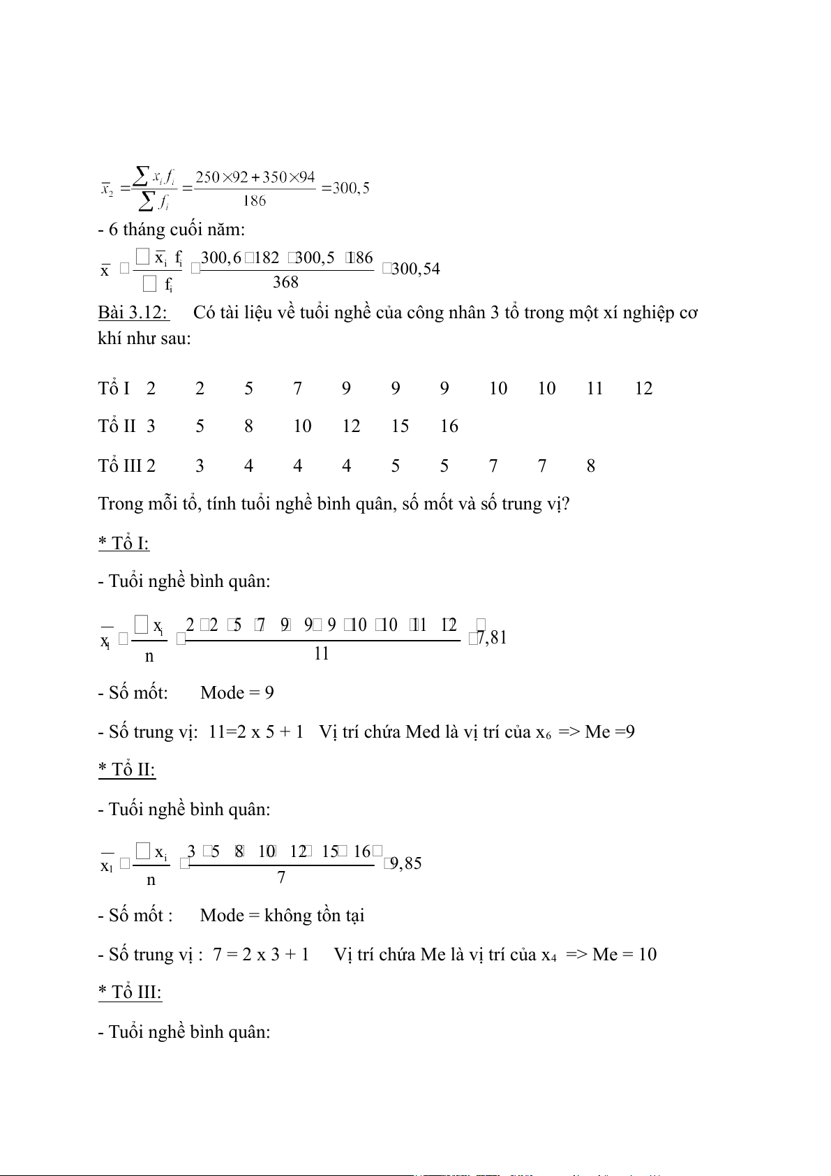 - Số trung vị: 11=2 x 5 + 1 Vị trí chứa Med là vị trí của x6 => Me =9 * Tổ II: - Tuối nghề bình quân: x 3 5 8 10 12 15 16 i x 9,85 1 n 7 - Số mốt : Mode = không tồn tại
