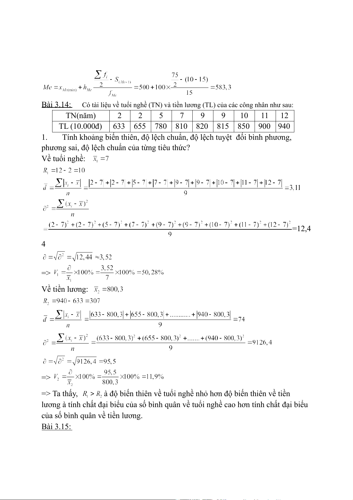 phương sai, độ lệch chuẩn của từng tiêu thức? Về tuổi nghề: =12,4 4 => Về tiền lương: => => Ta thấy,