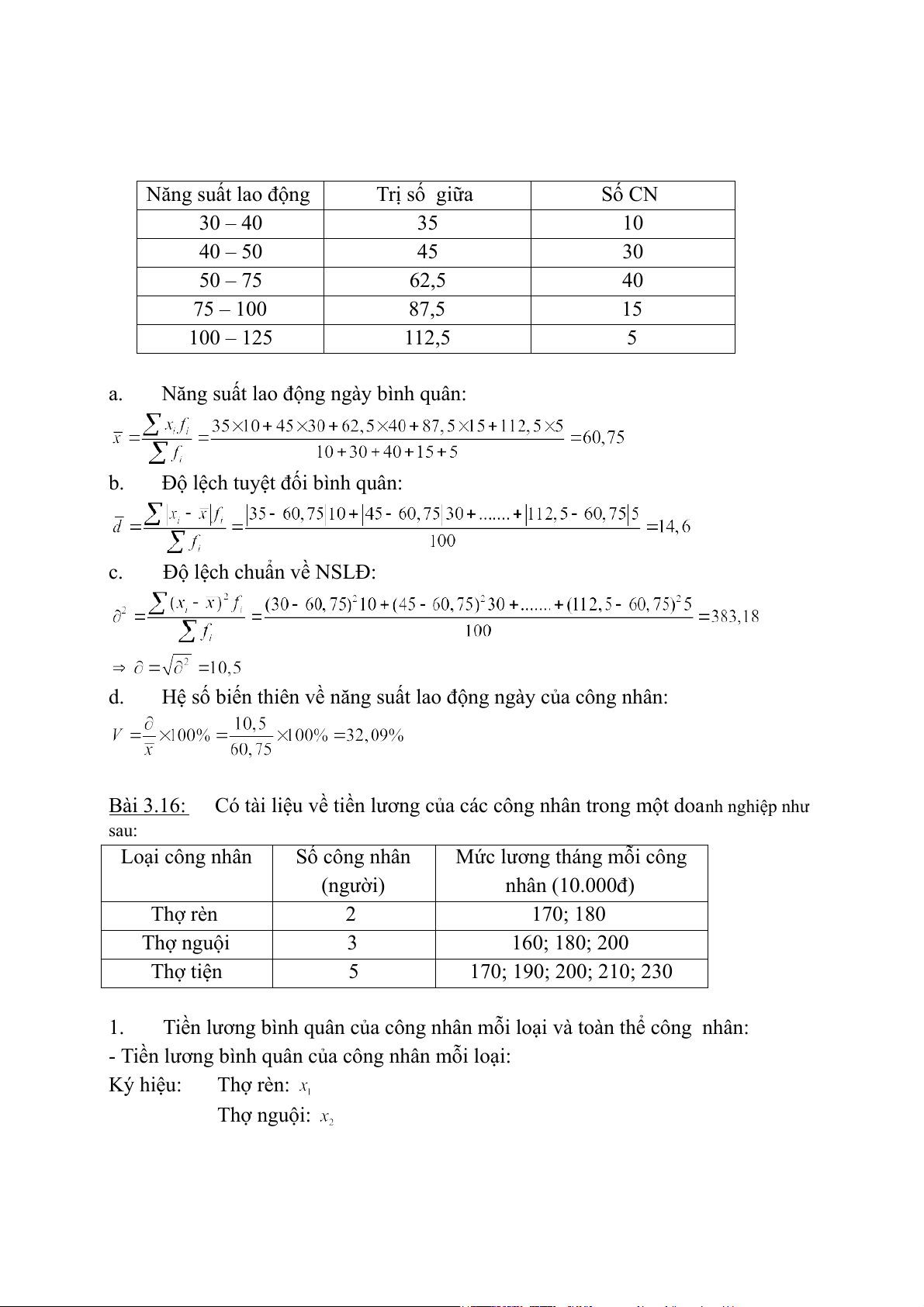 Hệ số biến thiên về năng suất lao động ngày của công nhân: Bài 3.16: