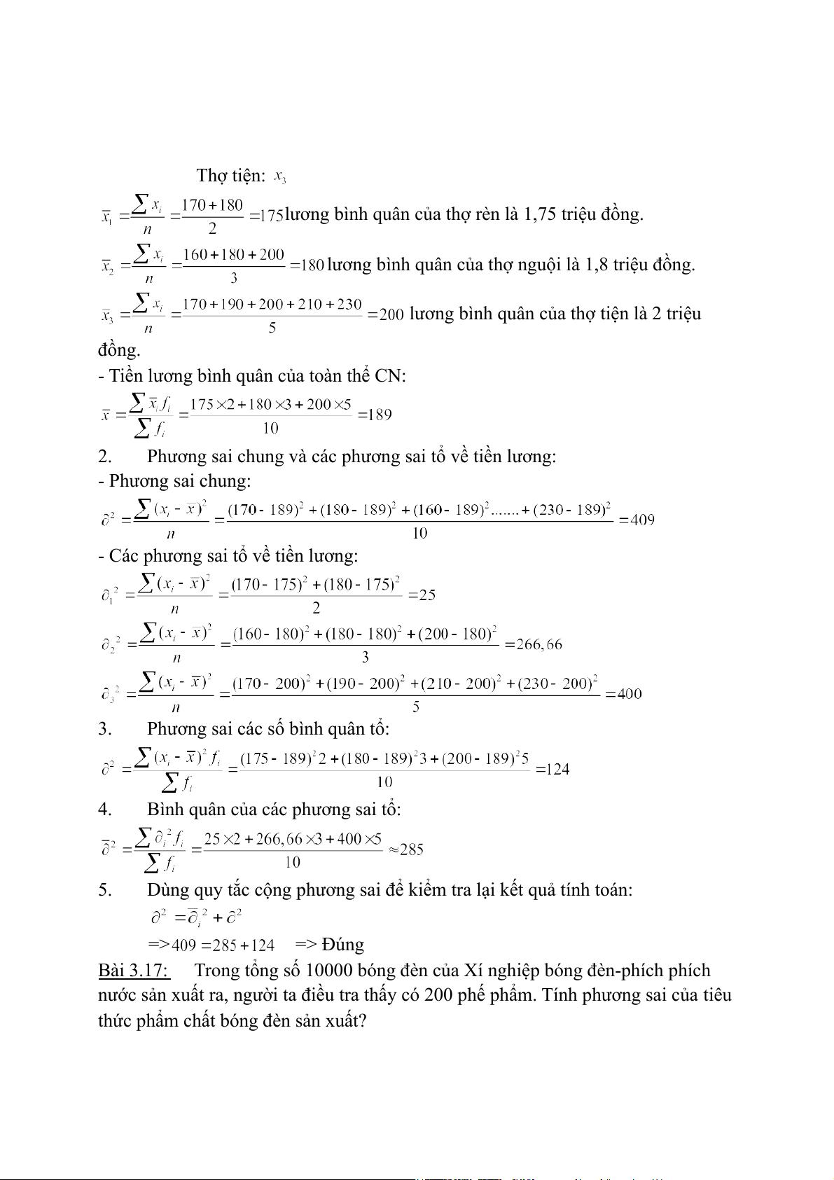 Dùng quy tắc cộng phương sai để kiểm tra lại kết quả tính toán: => => Đúng Bài 3.17: