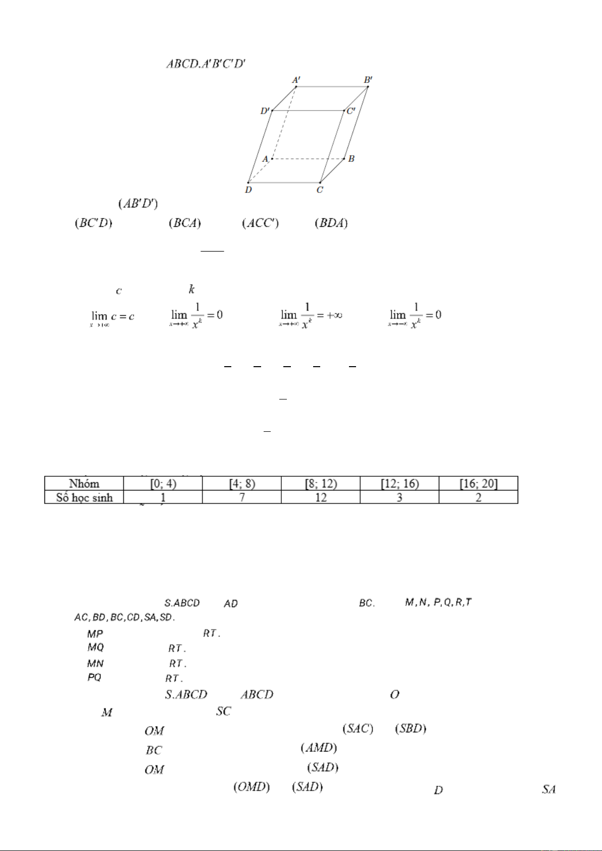 Câu 12. Cho các giới hạn: lim 𝑓(𝑥) = −3; lim 𝑔(𝑥) = 2, hỏi −6 lim 𝑓(𝑥) + 2 lim 𝑔(𝑥) bằng  𝑥→𝑥0 𝑥→𝑥0 𝑥→𝑥0 𝑥→𝑥0 A. 1 − .  B. 22 .  C. −2 .  D. 2 .