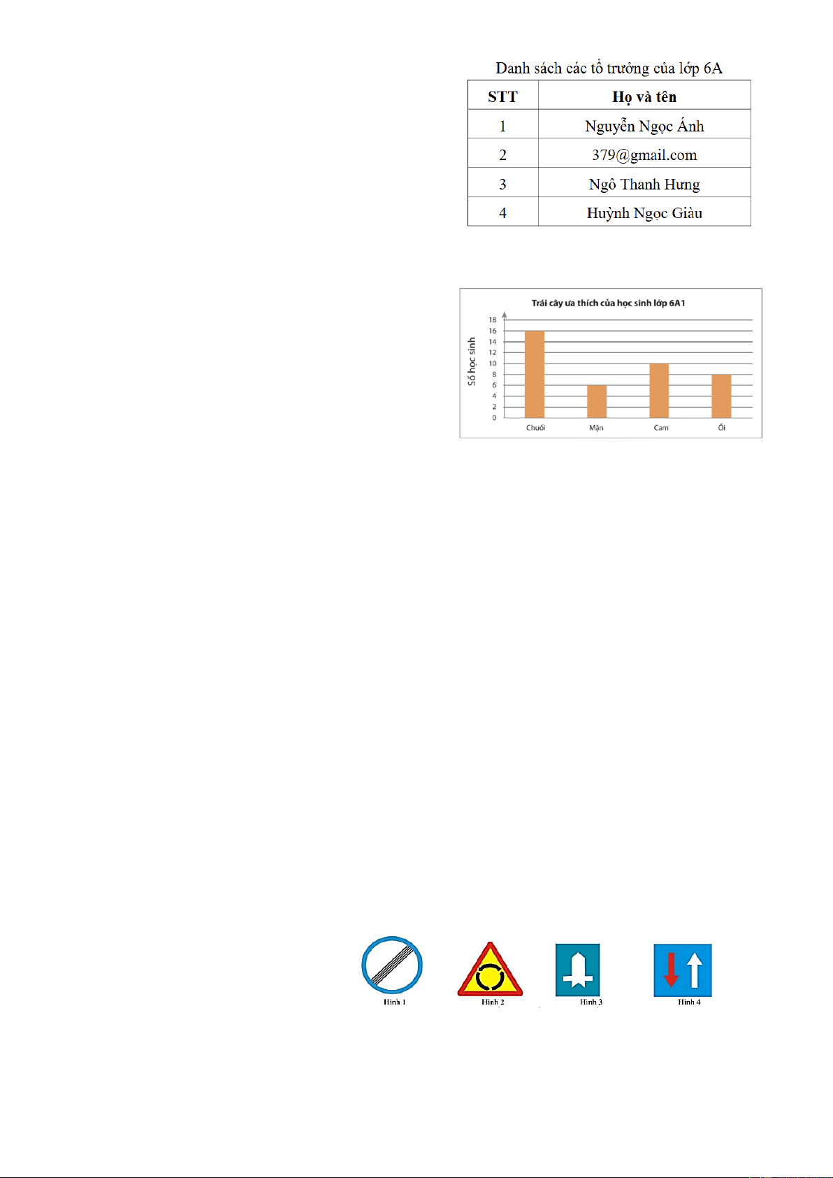 Câu 22: Danh sách học sinh nhóm 1 của lớp 6A như sau. Bạn số mấy cung cấp thông tin không hợp lí: STT Họ và tên 1 0909335213 2 Bùi Minh Hằng 3 Nguyễn Hoàng Anh 4 Lê Ngọc Diệp A. 1 B. 2 C. 3 D. 4