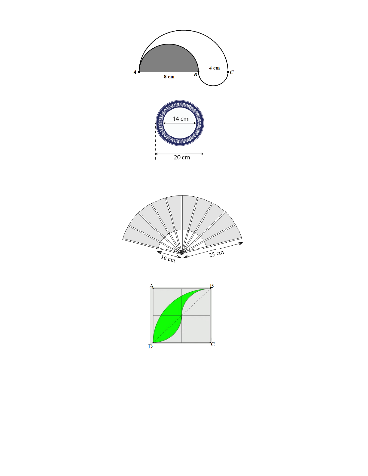 Bài 22. Tính diện tích phần không tô màu, giới hạn bởi nửa đường tròn đường kính AC, nửa đường tròn đường