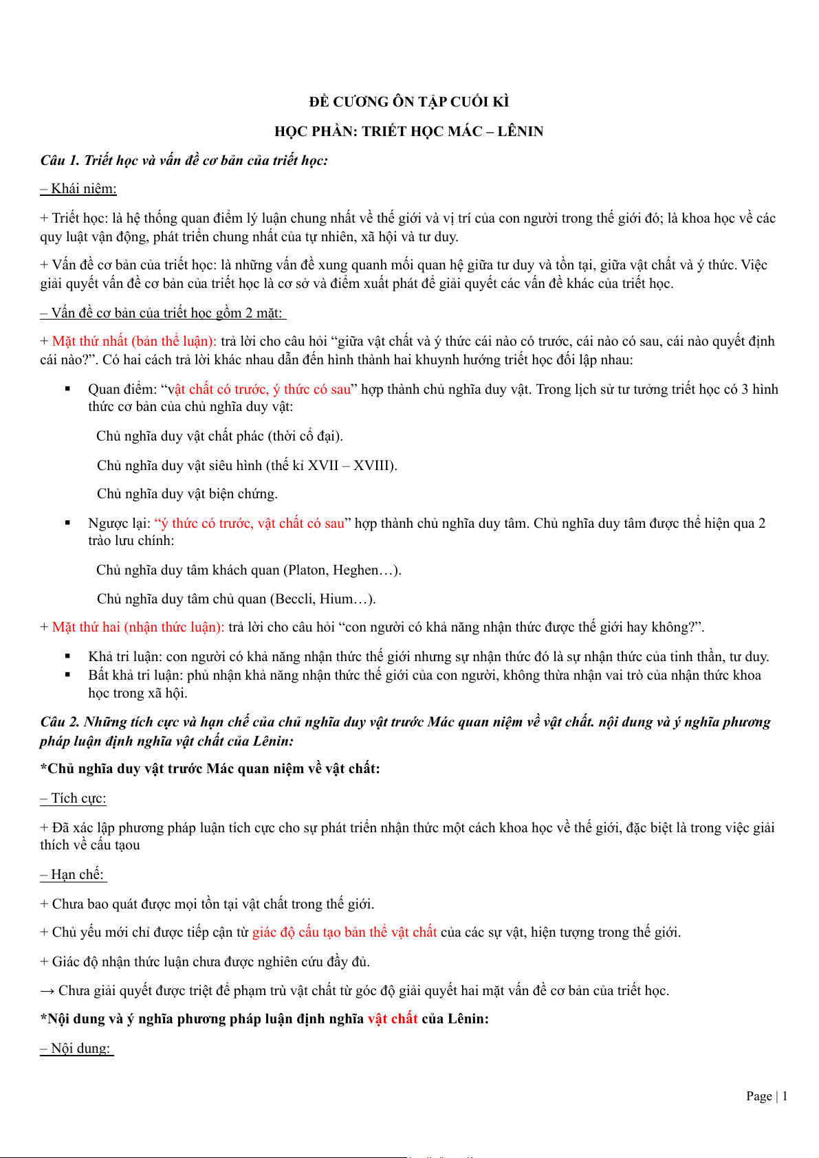 *Nội dung và ý nghĩa phương pháp luận định nghĩa vật chất của Lênin: – Nội dung: Page | 1