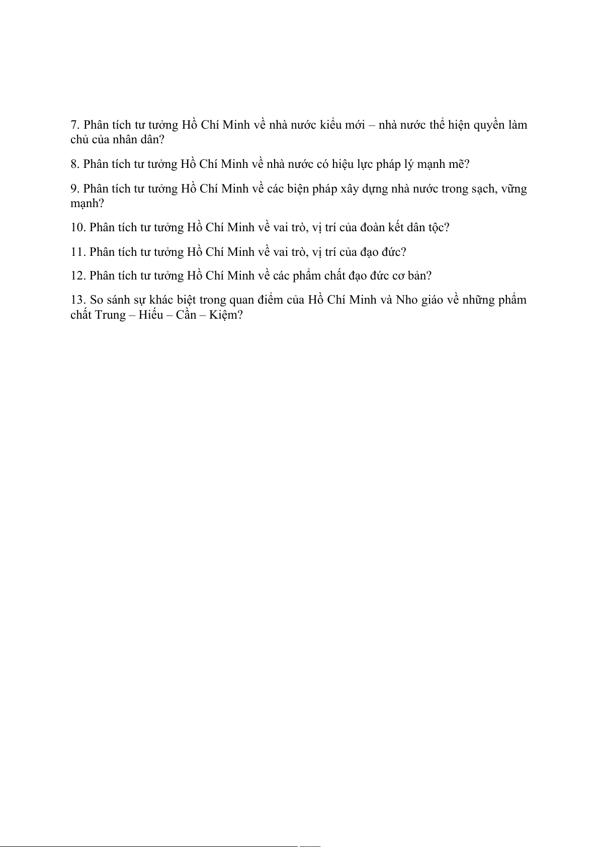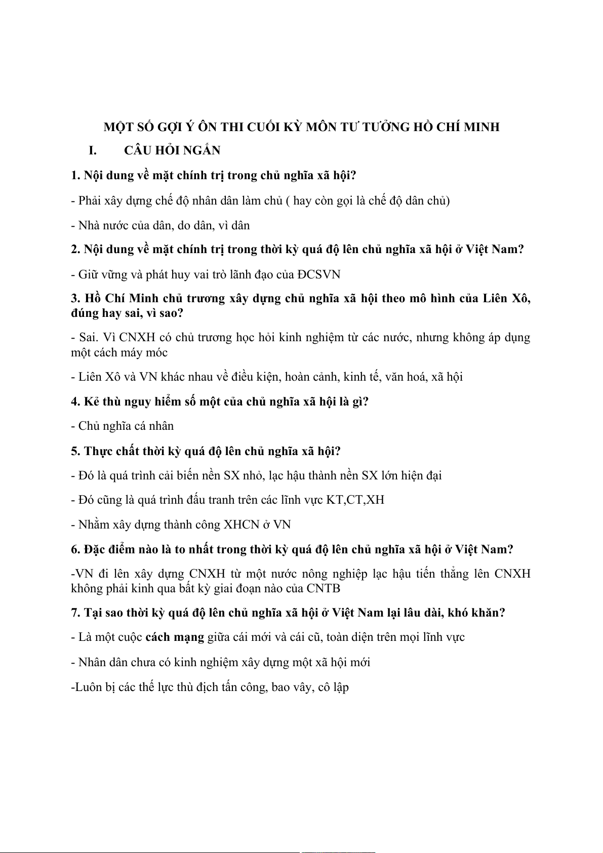 MỘT SỐ GỢI Ý ÔN THI CUỐI KỲ MÔN TƯ TƯỞNG HỒ CHÍ MINH I. CÂU HỎI NGẮN