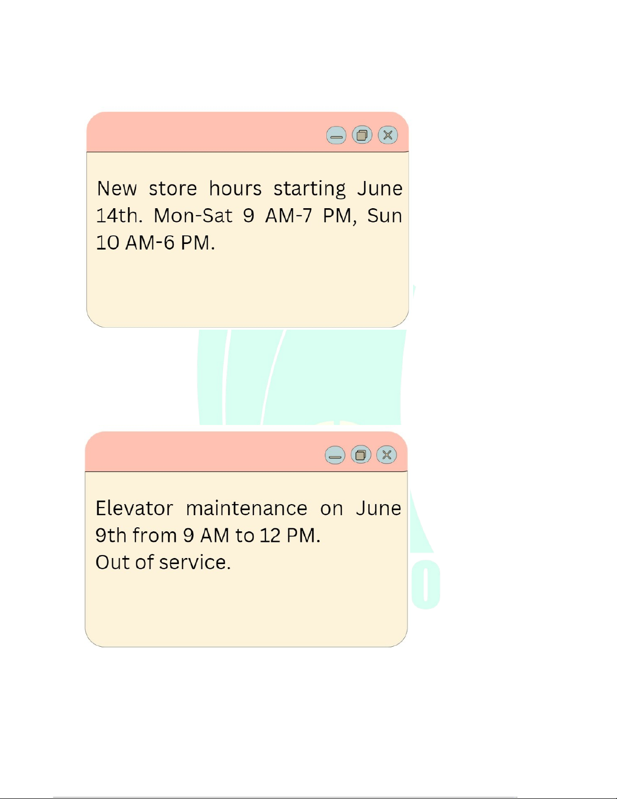 D. Elevator maintenance will take place on June 9th from 9 AM to 12 PM IV.