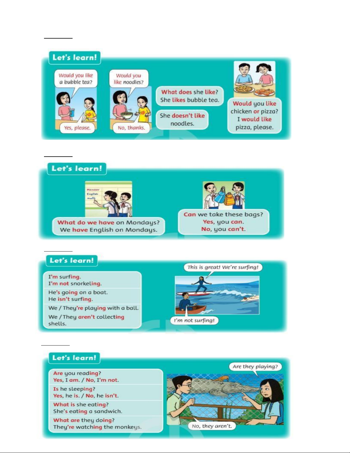 3. What is your favorite food? What food don’t you like? 4. How are you? 5. How can you go to school?