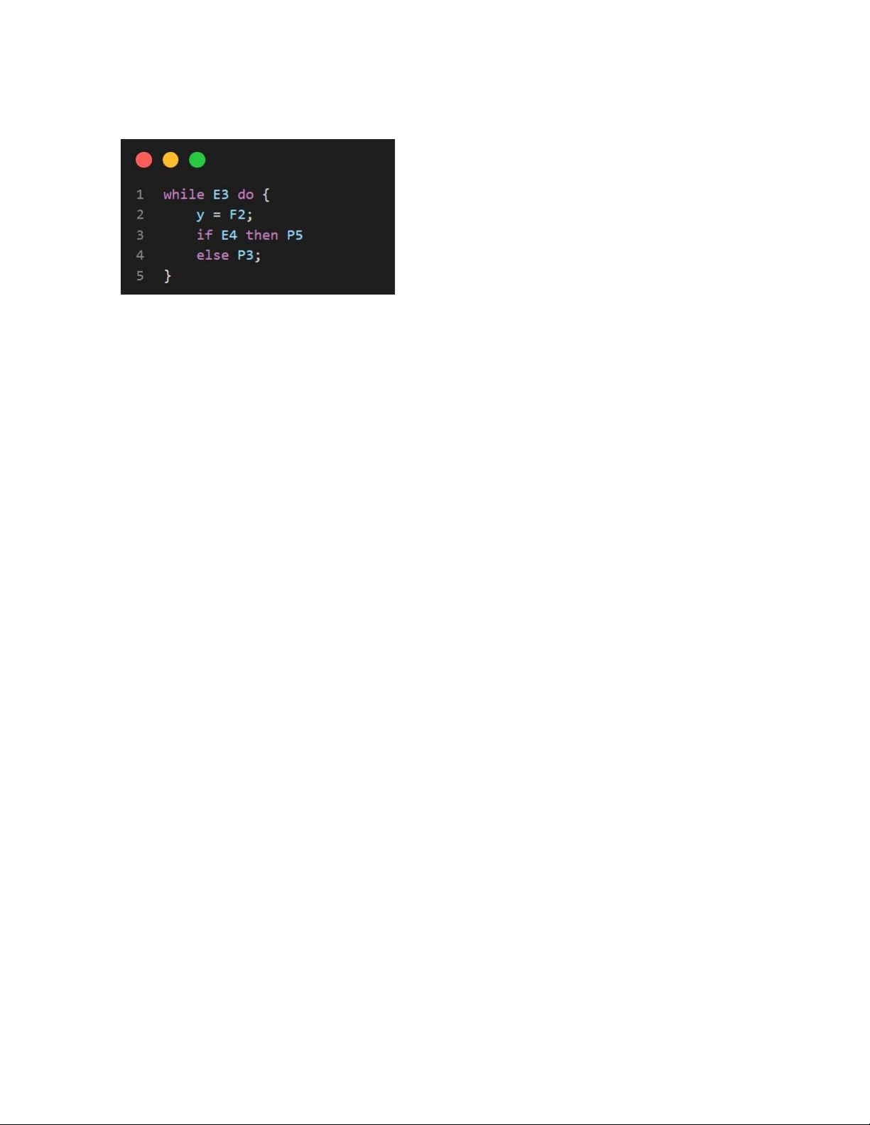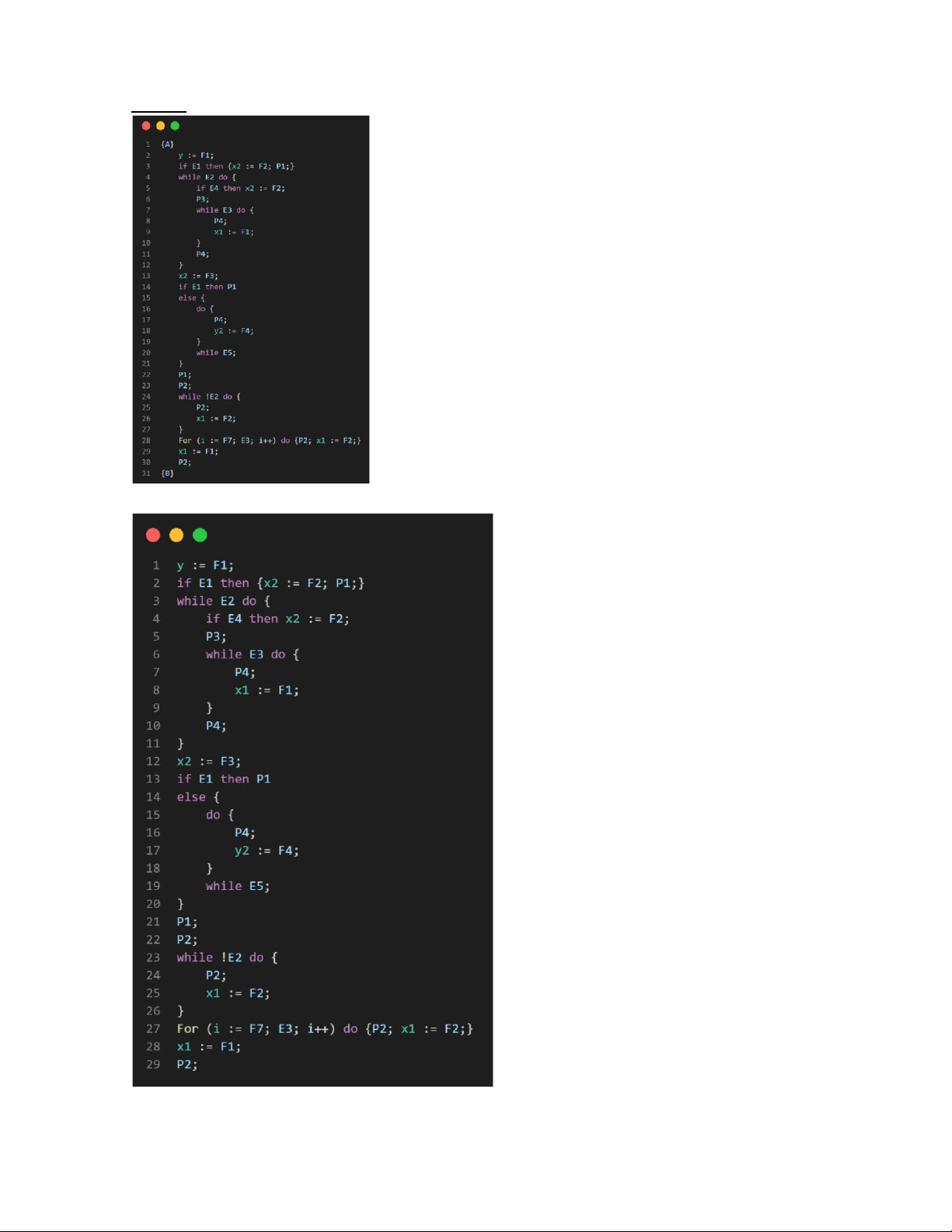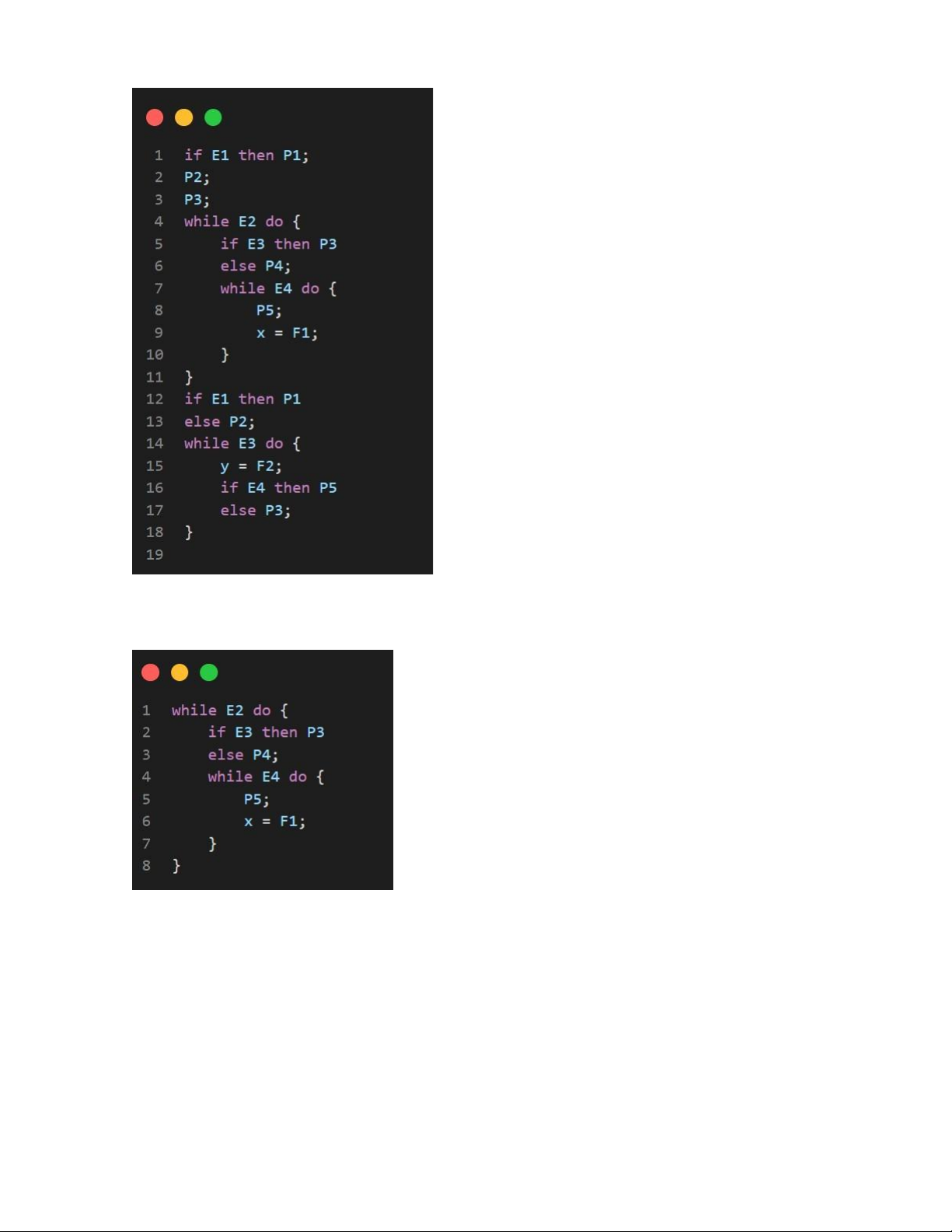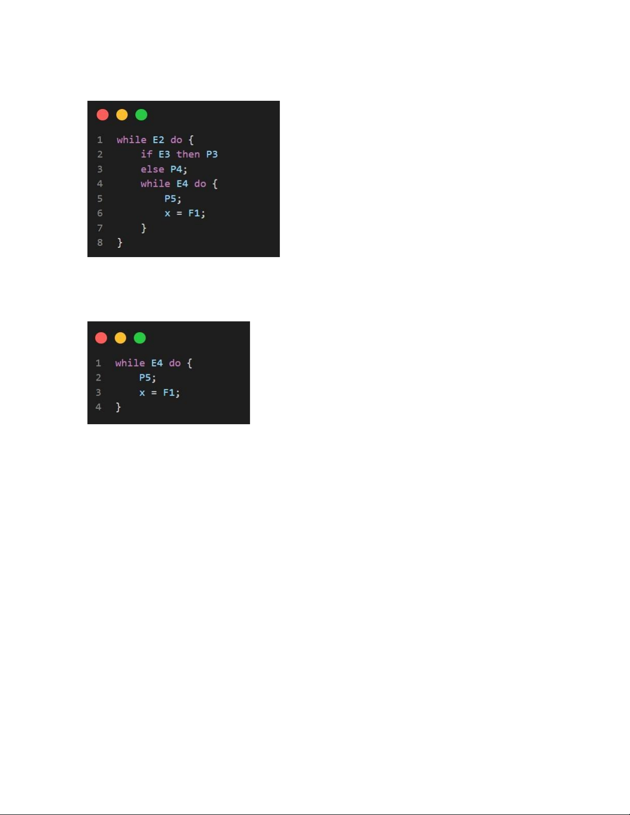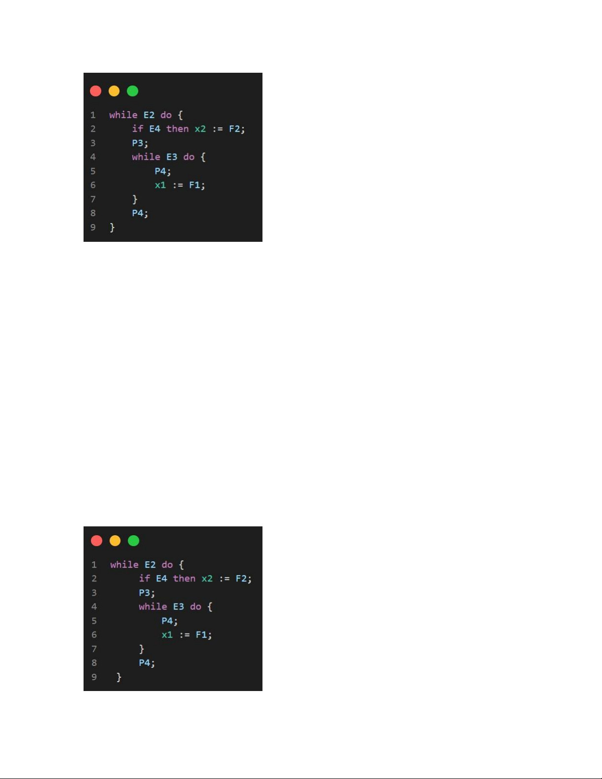 trình while E2 do { P3; while E3 do P4; if E4 then x := F3; }