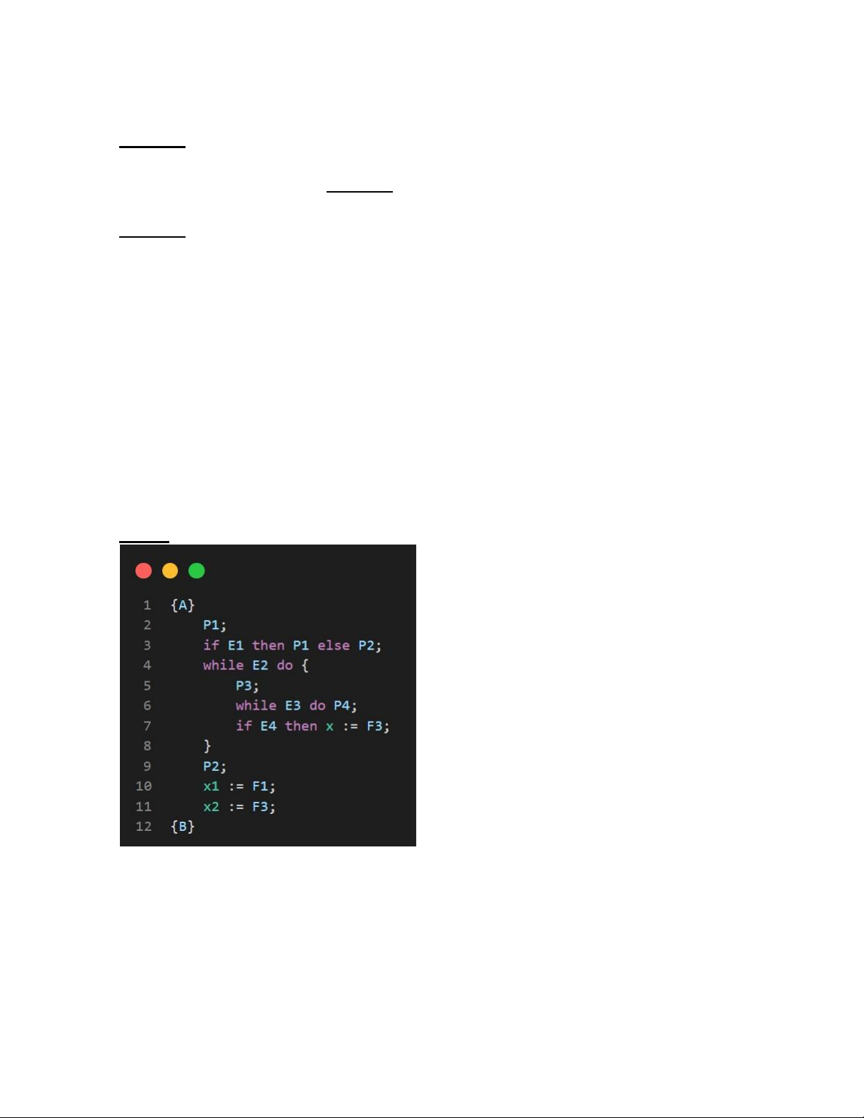 Bước 1: Ta có đoạn chương trình P như sau: {A} lOMoAR cPSD| 59691467 P1; if E1 then P1 else P2; while E2 do { P3; While E3 do P4; if E4 then x:= F3; } P2; x1:= F1; x2 = F3; {B}