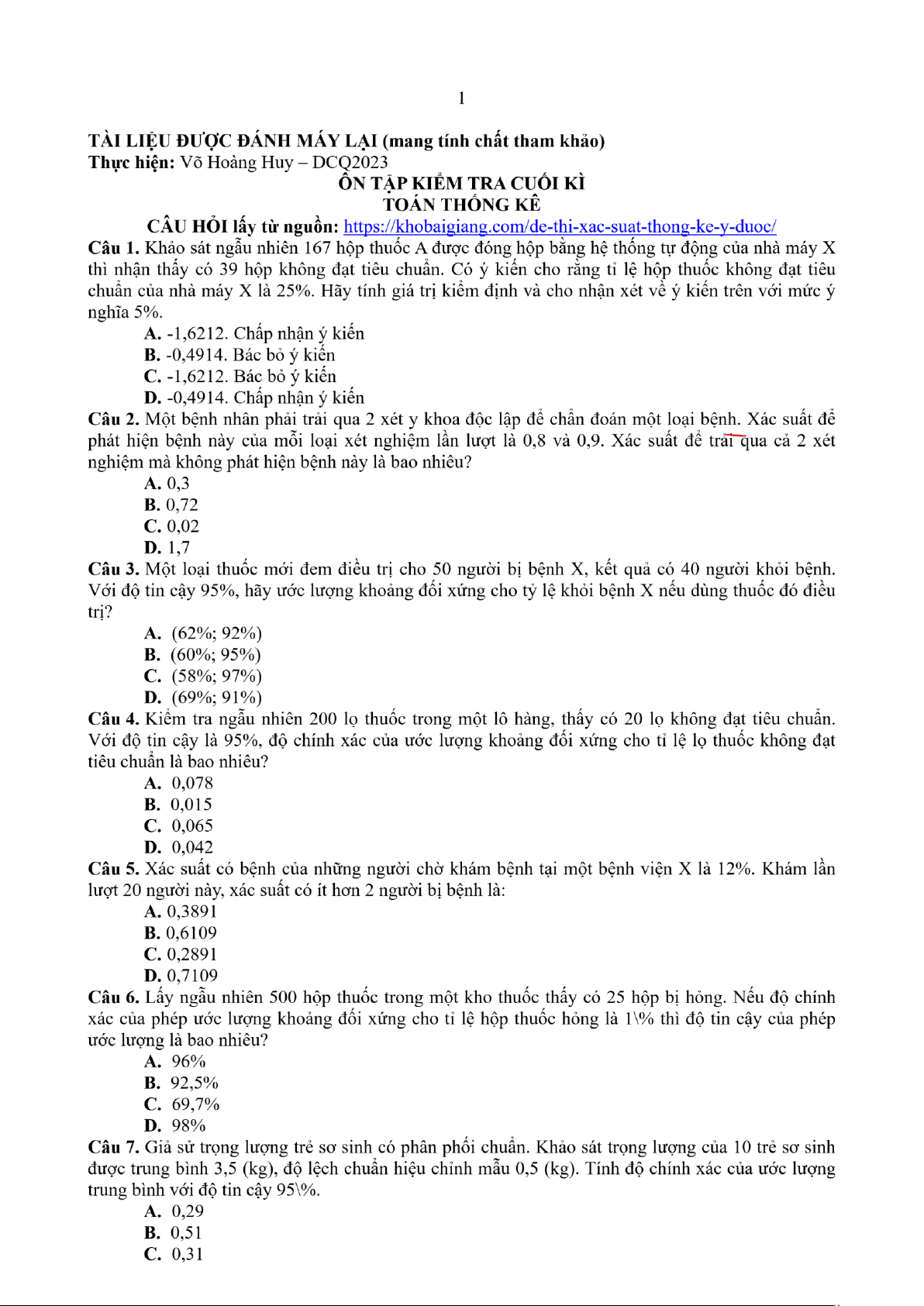 Câu 1. Theo NC3. Tính tỷ lệ những người khỏe mạnh trong dân số D: A. 0.50 B. 0.68 C. 0.75 D.