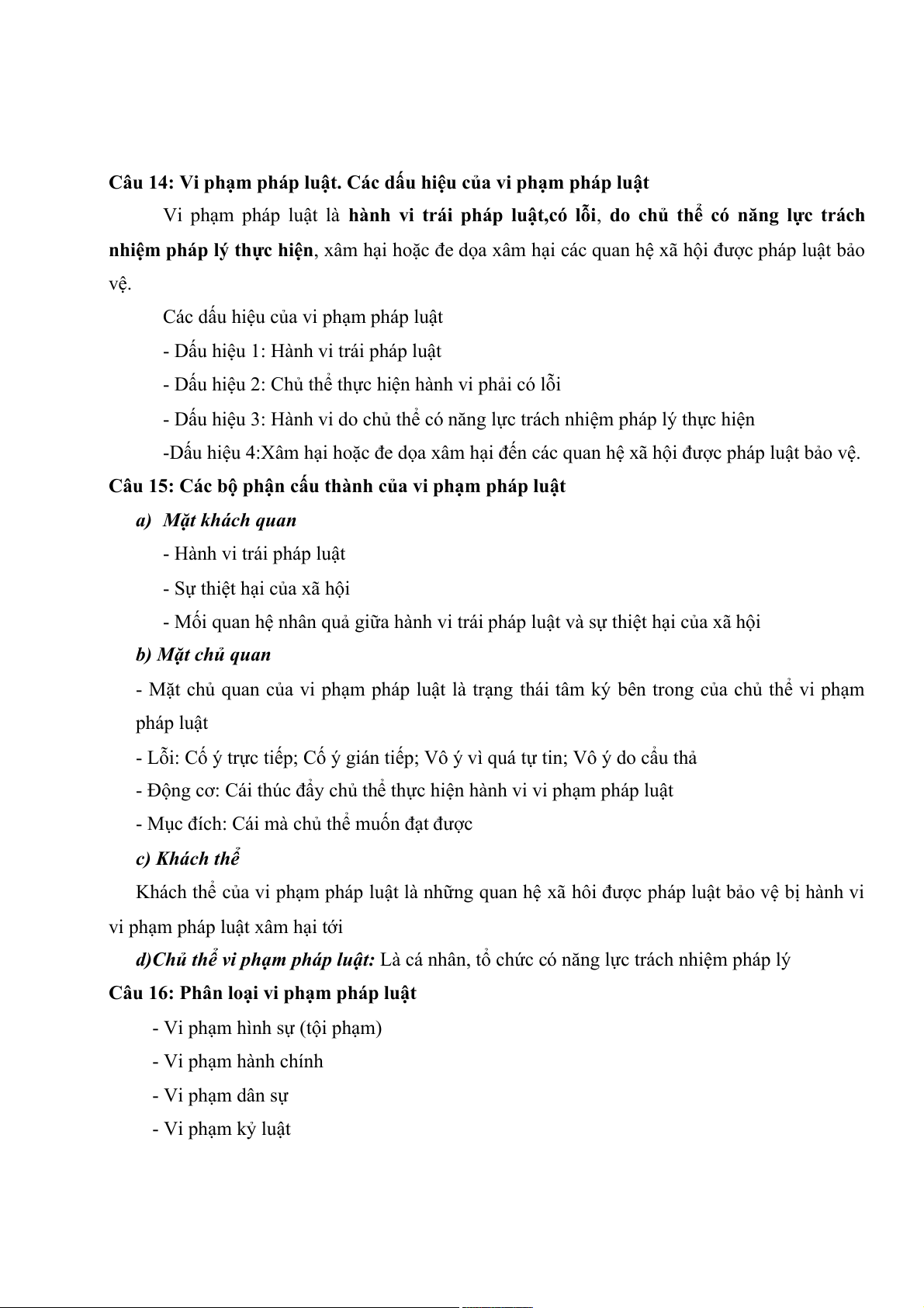 Câu 15: Các bộ phận cấu thành của vi phạm pháp luật
