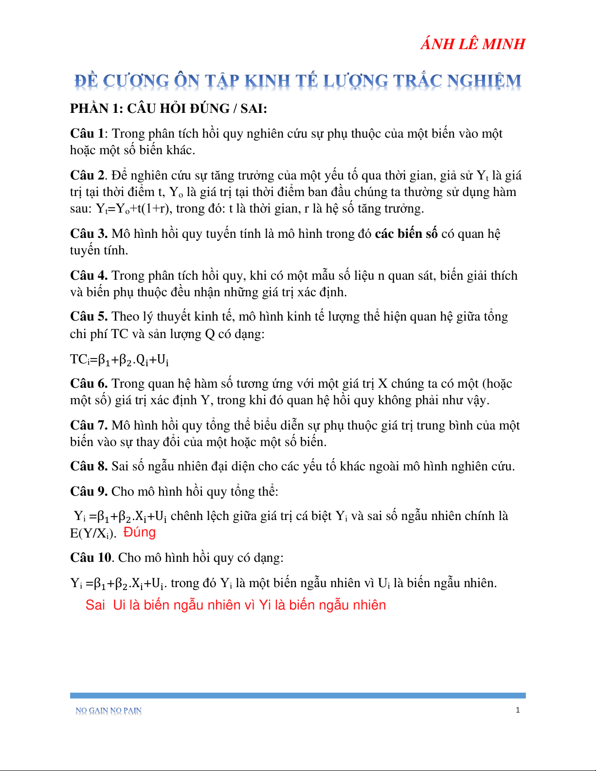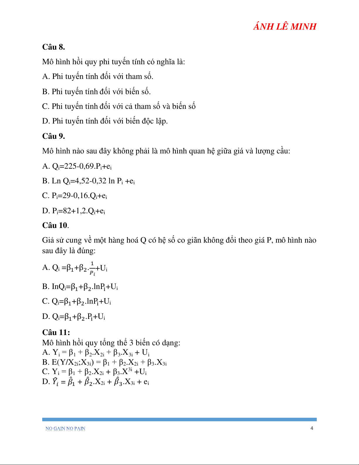 A. Ln Yt = lnYo+ t.ln(1+r) + Ui 2 ÁNH LÊ MINH B. Yt= Yo+ t(1+𝛼) +Ui C. LPi = 𝛽1+𝛽2. 1 +Ui 𝑇𝑁𝑖 D.lnLPi=𝛽1+𝛽2.lnTNi+Ui Câu 5.