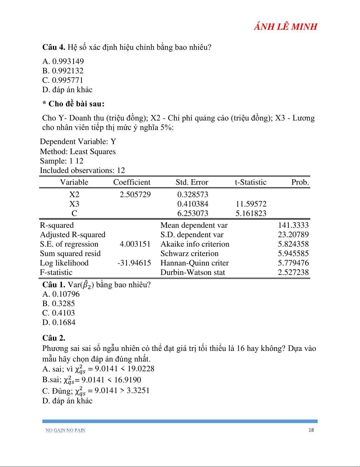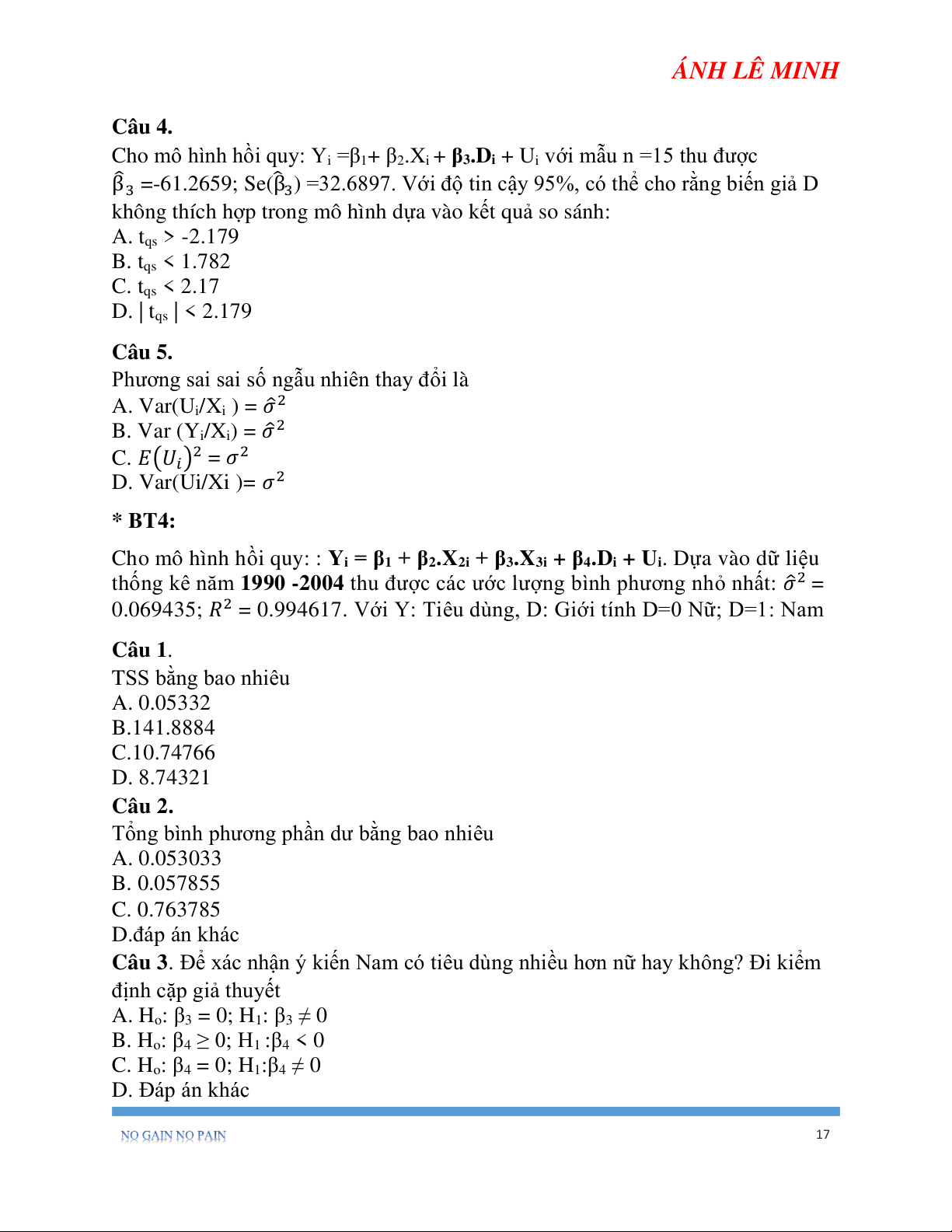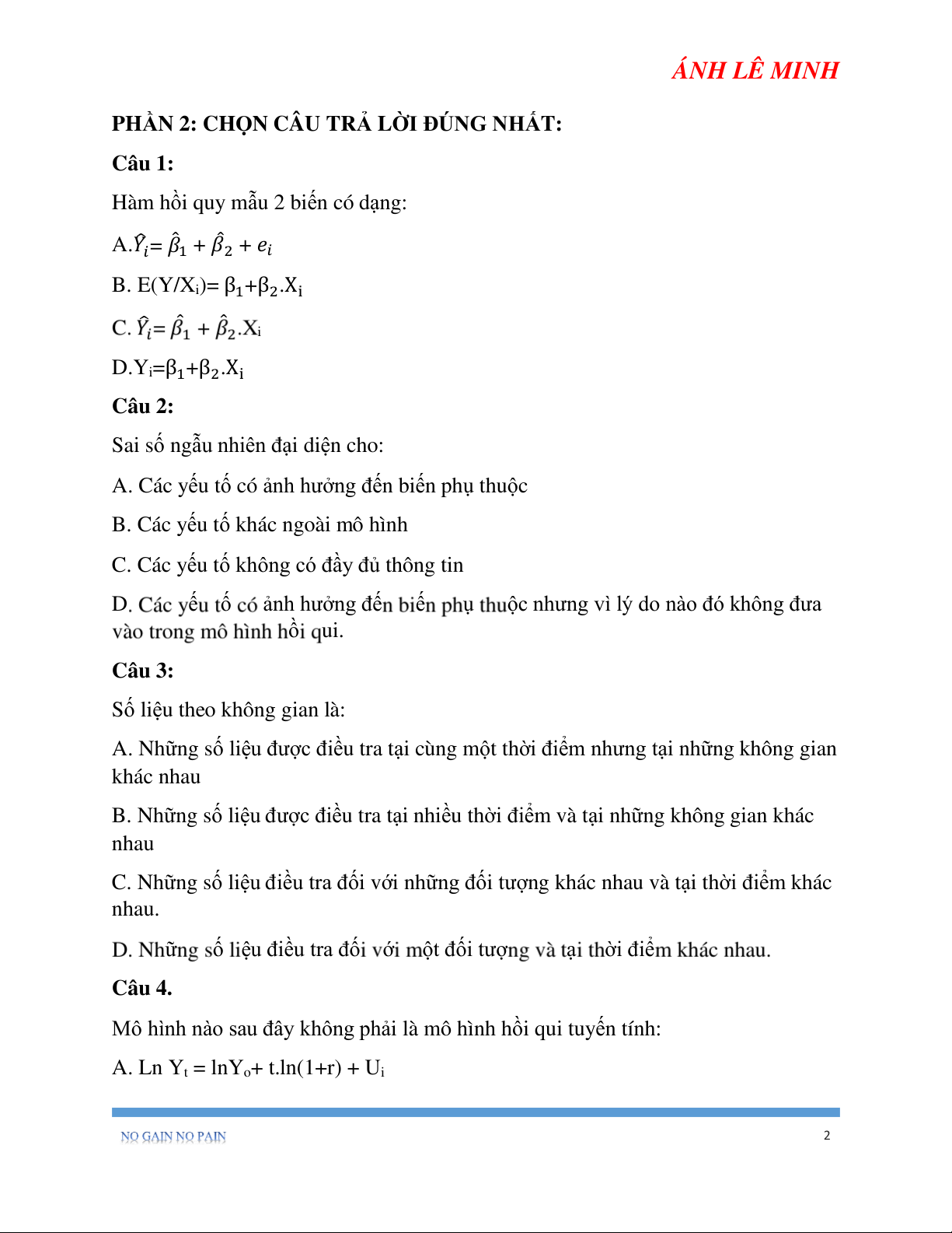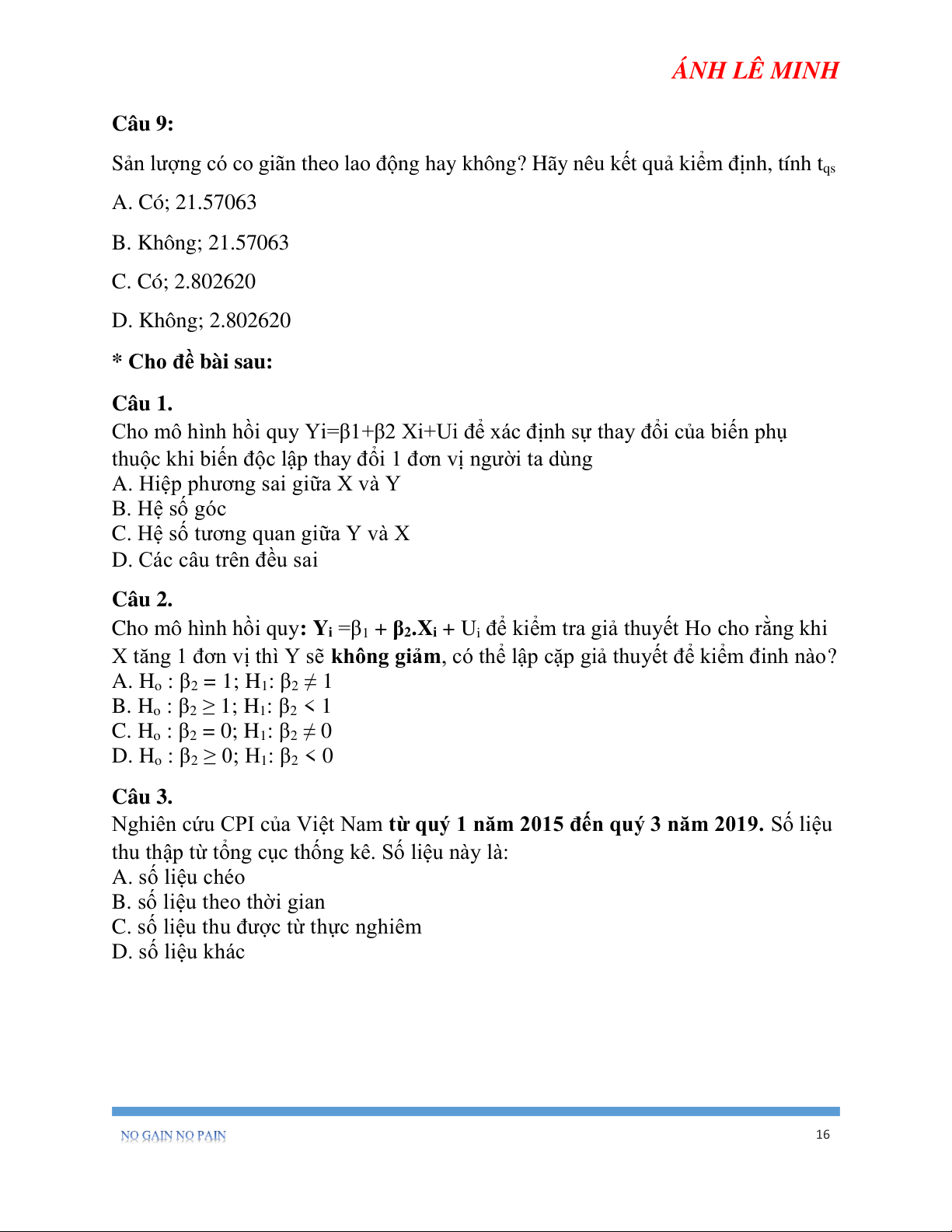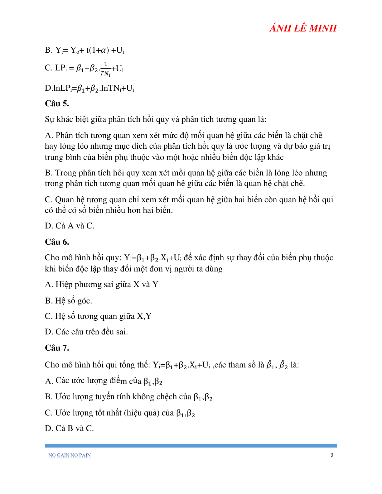 C. Ước lượng tốt nhất (hiệu quả) của β1,β2 D. Cả B và C. 3 ÁNH LÊ MINH Câu 8.