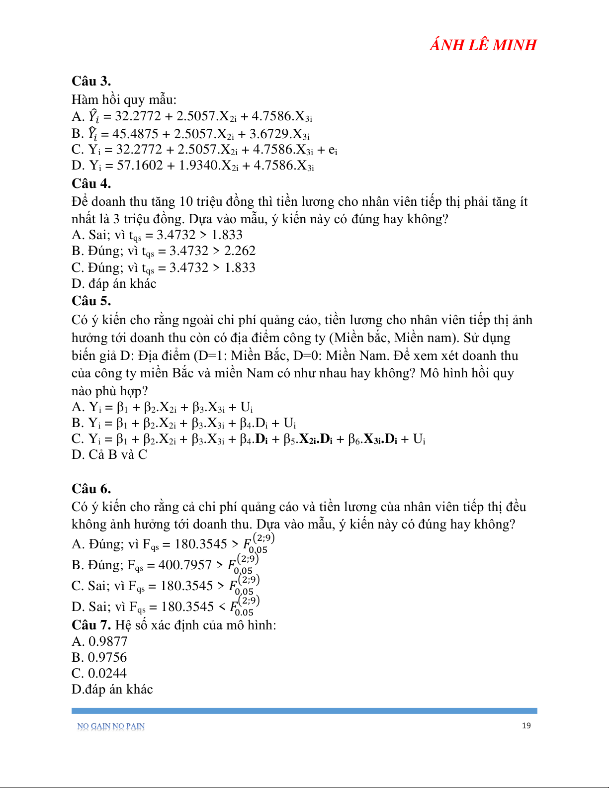 C. Đúng; χ2𝑞𝑠 = 9.0141 > 3.3251 D. đáp án khác 18 ÁNH LÊ MINH Câu 3. Hàm hồi quy mẫu: