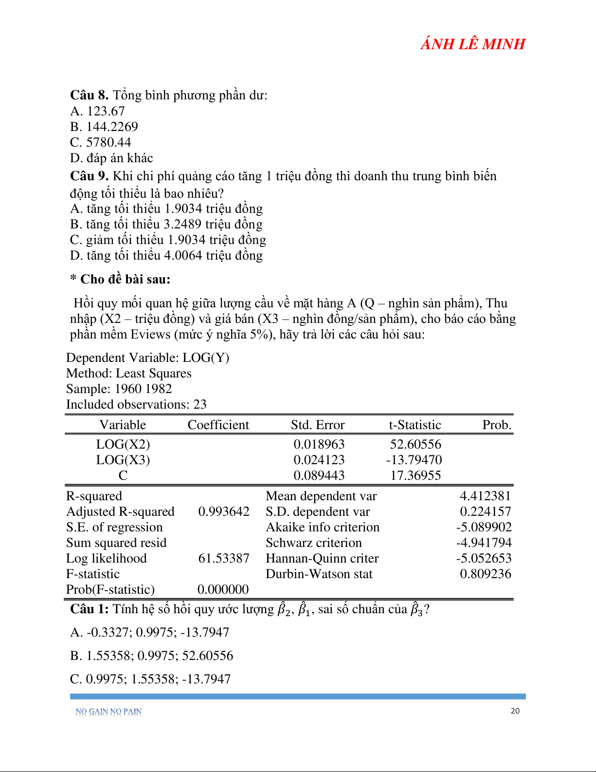 Câu 8. Tổng bình phương phần dư: A. 123.67 B. 144.2269 C. 5780.44 D. đáp án khác