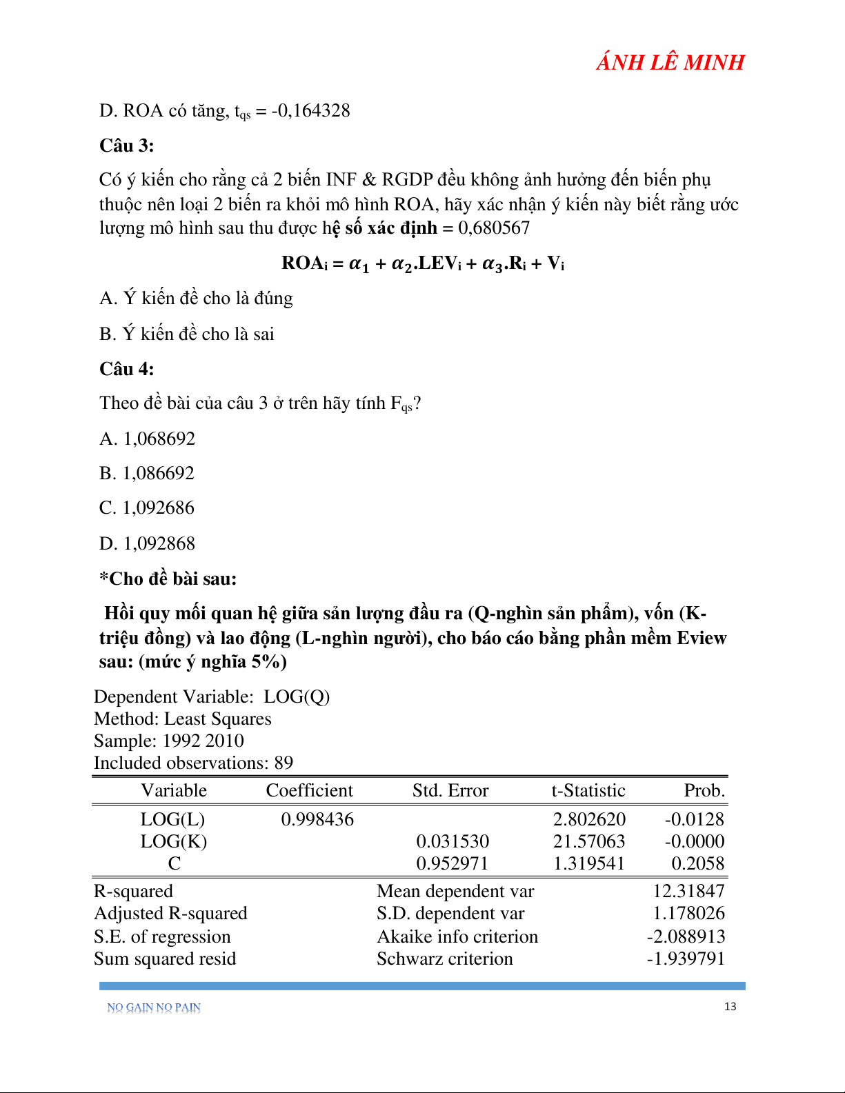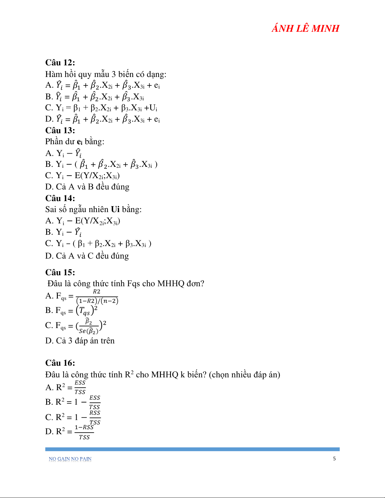 D. 𝑌𝑖 = 𝛽1 + 𝛽2.X2i + 𝛽3.X3i + ei 4 ÁNH LÊ MINH Câu 12: