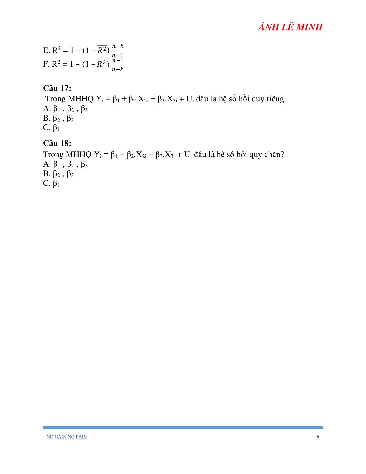 E. R2 = 1 – (1 – 𝑅2) 𝑛−𝑘 𝑛−1 F. R2 = 1 – (1 – 𝑅2 ) 𝑛−1 𝑛−𝑘 Câu 17: