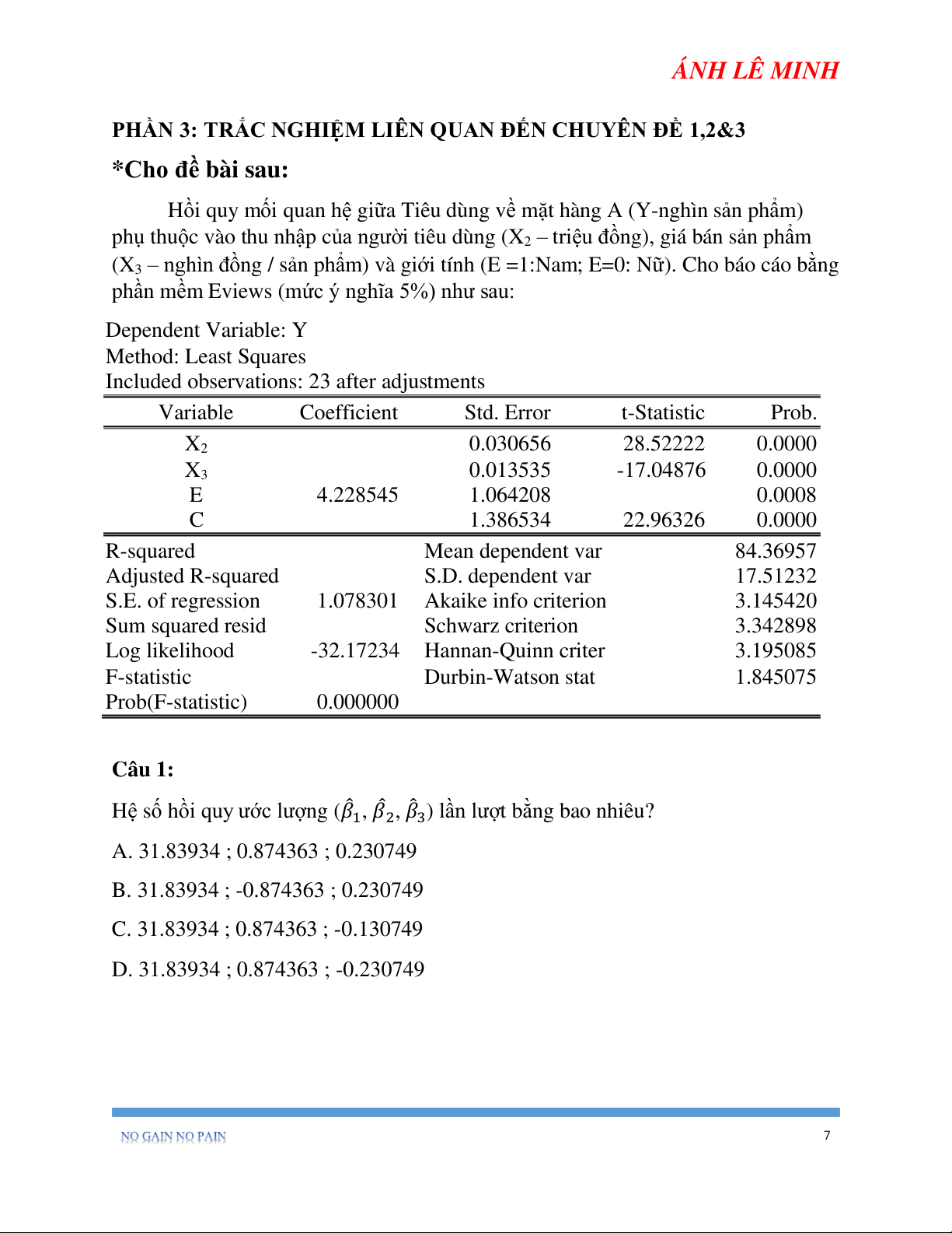 Câu 3. Để xác nhận ý kiến Nam có tiêu dùng nhiều hơn nữ hay không? Đi kiểm định cặp giả thuyết A. Ho: β3 = 0; H1: β3 ≠ 0