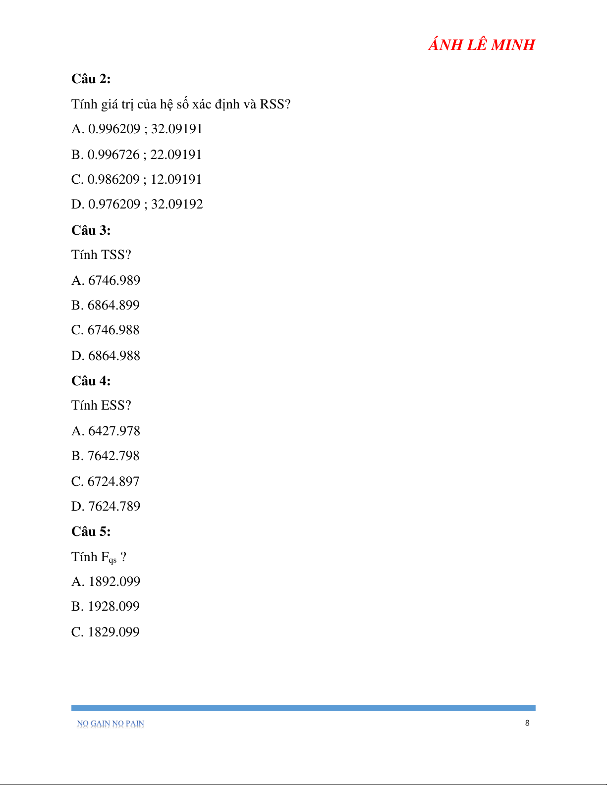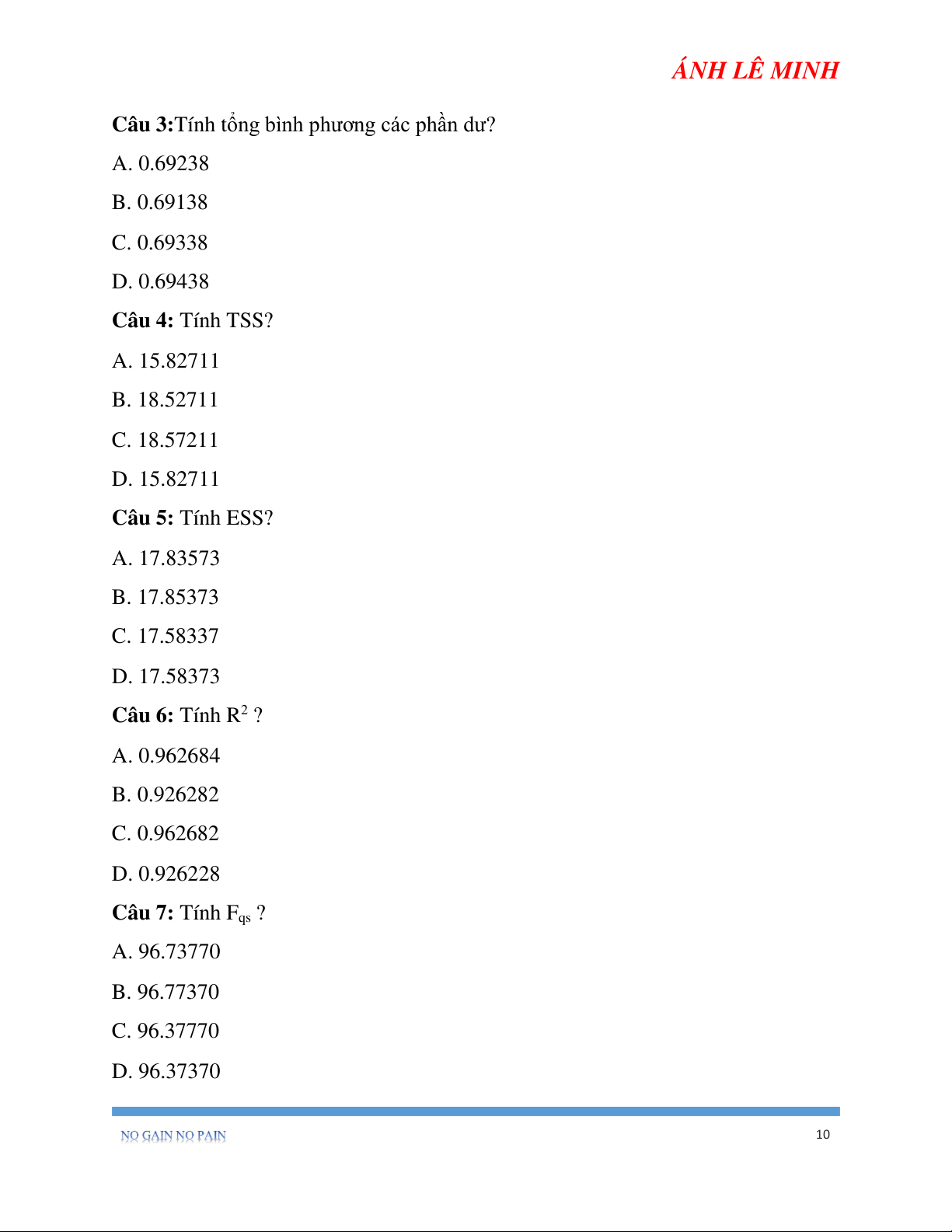 Tính giá trị của hệ số xác định và RSS? A. 0.996209 ; 32.09191 B. 0.996726 ; 22.09191 C. 0.986209 ; 12.09191 D. 0.976209 ; 32.09192 Câu 3: Tính TSS? A. 6746.989 B. 6864.899 C. 6746.988 D. 6864.988 Câu 4: Tính ESS? A. 6427.978 B. 7642.798 C. 6724.897 D. 7624.789 Câu 5: Tính Fqs ? A. 1892.099 B. 1928.099 C. 1829.099 8 ÁNH LÊ MINH