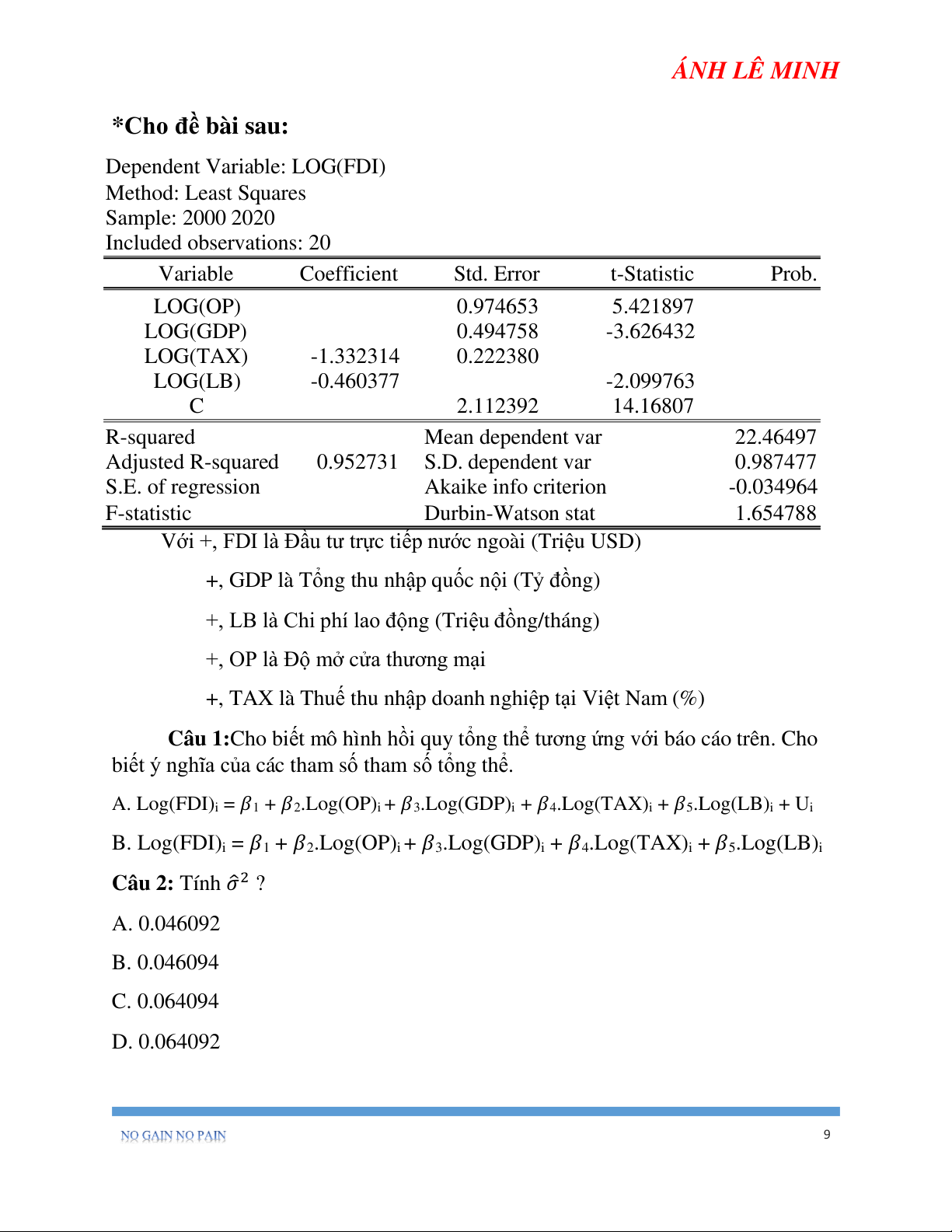 *Cho đề bài sau: Dependent Variable: LOG(FDI) Method: Least Squares Sample: 2000 2020 Included observations: 20 Variable Coefficient Std. Error t-Statistic Prob. LOG(OP) 0.974653 5.421897 LOG(GDP) 0.494758 -3.626432 LOG(TAX) -1.332314 0.222380 LOG(LB) -0.460377 -2.099763 C 2.112392 14.16807 R-squared Mean dependent var 22.46497 Adjusted R-squared 0.952731 S.D. dependent var 0.987477 S.E. of regression Akaike info criterion -0.034964 F-statistic Durbin-Watson stat 1.654788